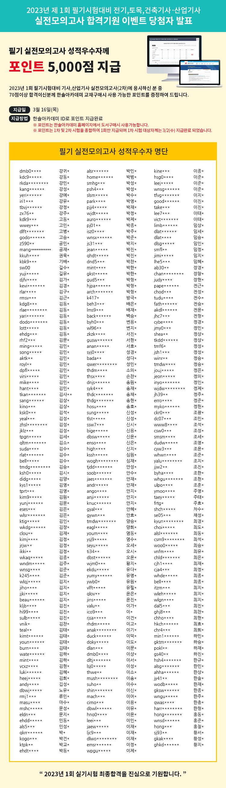 제 1회 건축기사, 산업기사 필기 실전모의고사(2차) 성적우수자 이벤트 당첨자 발표