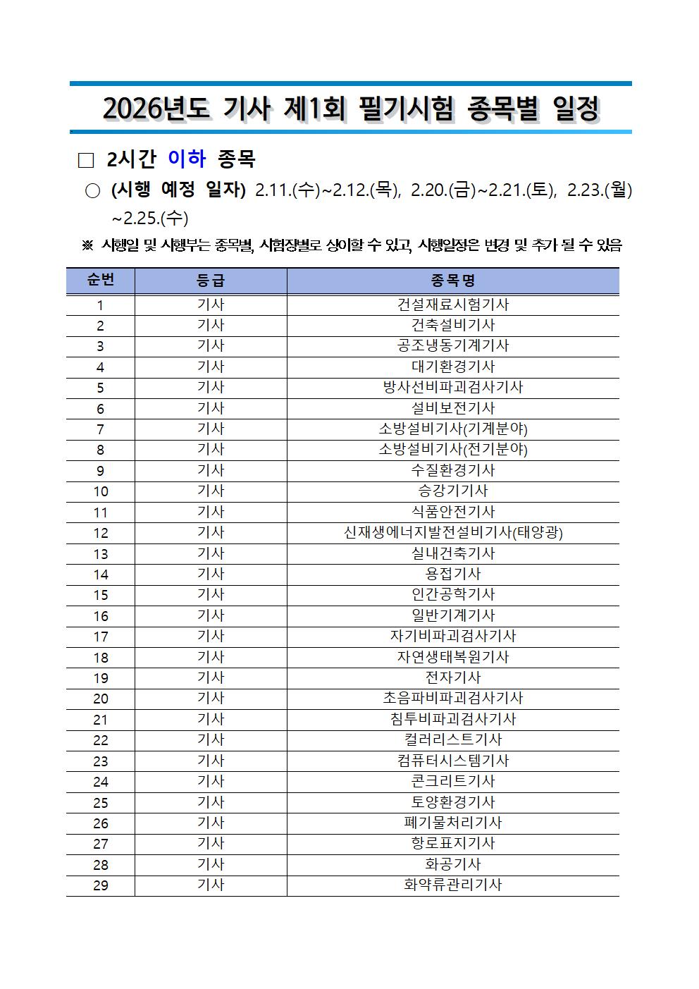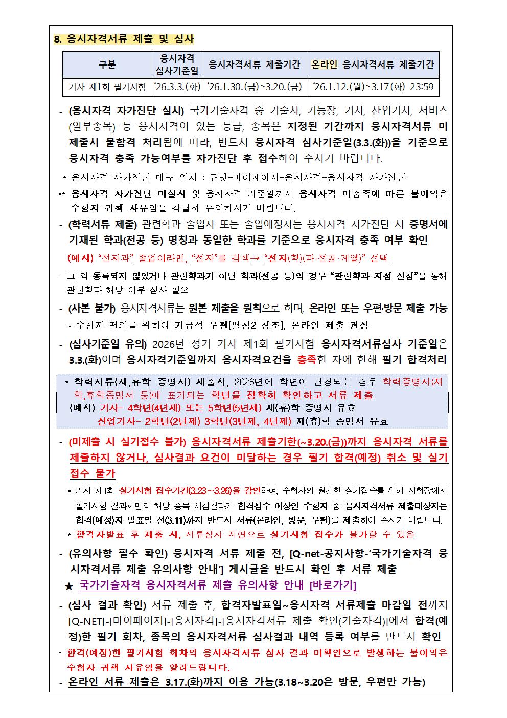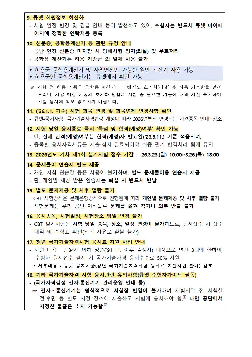 2026년도 기사 제1회 필기시험 원서접수 주요사항을 붙임과 같이 안내드리오니, 수험자 여러분께서는 붙임내용을 참고하시어 원서접수 및 응시에 착오 없으시기 바랍니다.