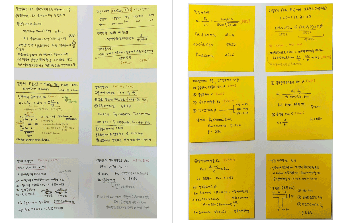 적산과 구조는 공책 한면에 질문, 다른면에 답과 풀이를 적고 기화펜으로 계속 풀었다. 적산은 기본서를 보니 도저 히 다 할 자신이 없어서 기출 역주행하면서 자주 나오는 문제들만 매일매일 반복해서 풀었다. 벽돌과 모르타르량, 거푸집량, 방수면적, 누름콘크리트량, 보호벽돌량, 터파기량이랑 운반대수, 헌치보, 비계면적 등등. 문제들 마다 까 먹지 말고 신경써서 계산해야 될 부분만 따로 메모해서 외웠다. (푸팅부분의 거푸집 수량 산출유무, 헌치보에서 거 푸집량 콘크리트량 관련 내용, 보호벽돌 구할 때 모서리에서 중복되는 벽돌 빼야된다던가 하는 것들) 어떻게 구하 는지 다 알고도 틀리면 화가 날 만한 것들을 눈에띄게 적어두고 놓치지 않으려고 했다. 구조도 블랙박스 순서대로 선택과 집중을 했다. 공부 시작과 끝쯤에 꼭 2~3문제씩 반복해서 풀었던게 적산과 구조였다. 이론들을 내 방식으로 정리하는게 도움이 많이 되었고, 적산과 구조 역시 학습게시판을 통해 교수님들의 도움을 많이 받았다ㅜㅜ