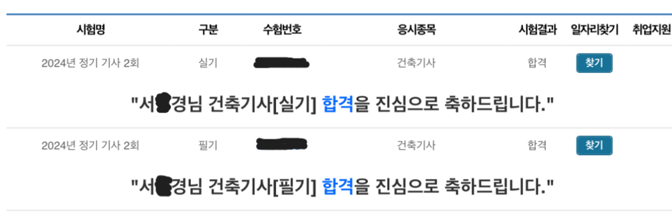 제2회 건축기사 최종합격 / 수강생 : 서 * 경