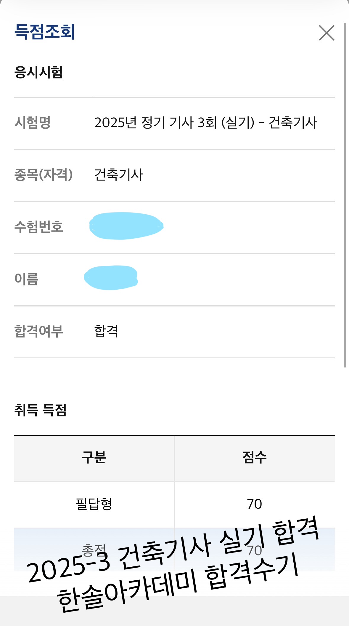 한솔아카데미의 책, 강의, 블로그 그리고 질문게시판 등을 통해 궁금증을 해결할 수 있었고, 그 덕분에 합격 수 있었습니다. 감사합니다~ |
