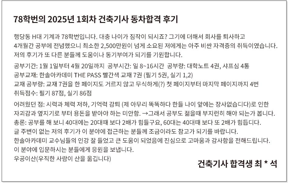 · 25년도 1회차 건축기사 동회차 합격 수기(건축학과지만 사실 노베이스)