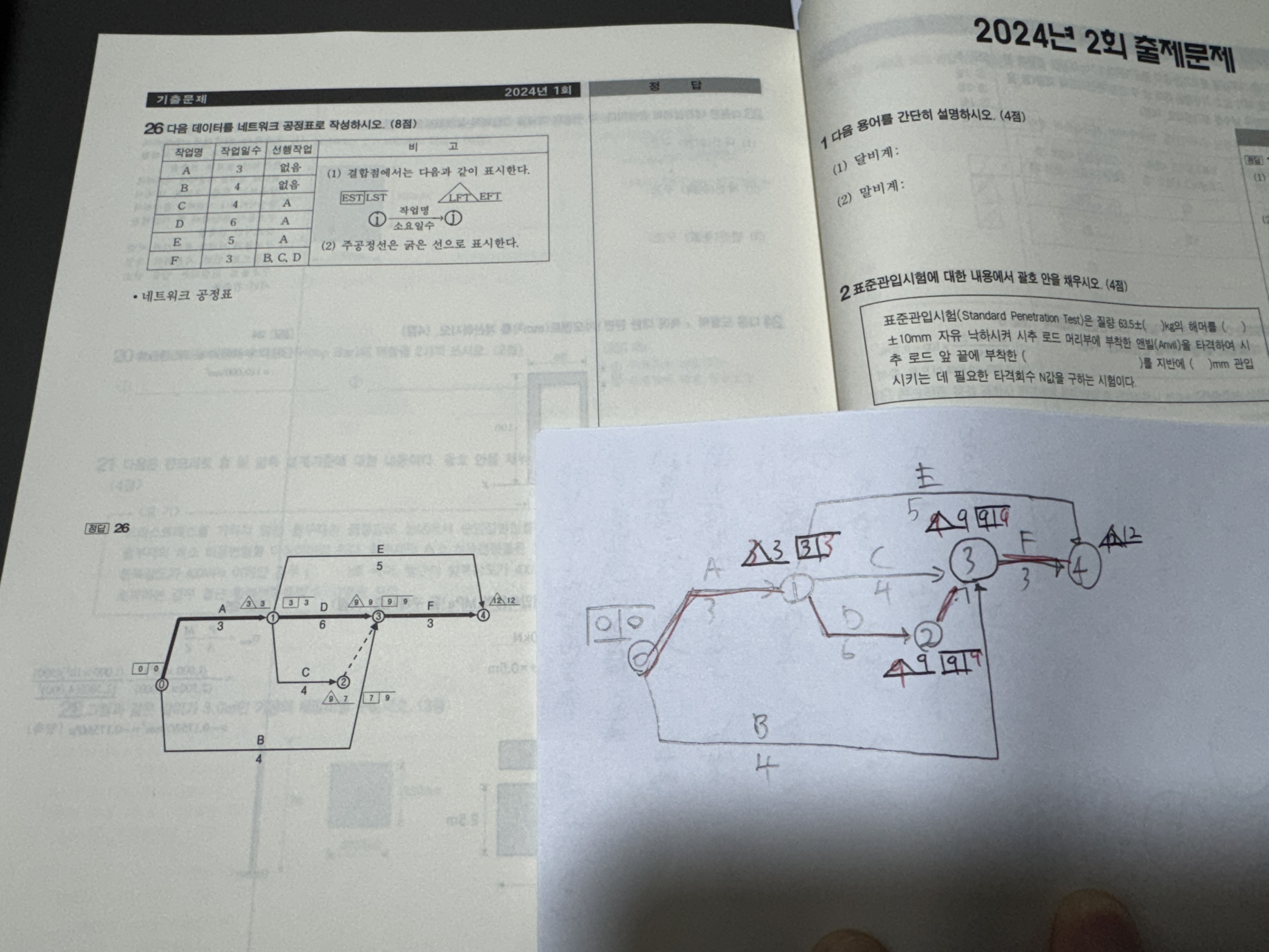 안녕하세요! 다름이 아니라 공정표 관련해서 질문이 있습니다. 제가 그린 오른쪽 공정표도 정답이 될까요? 알려주시면 정말 감사하겠습니다
