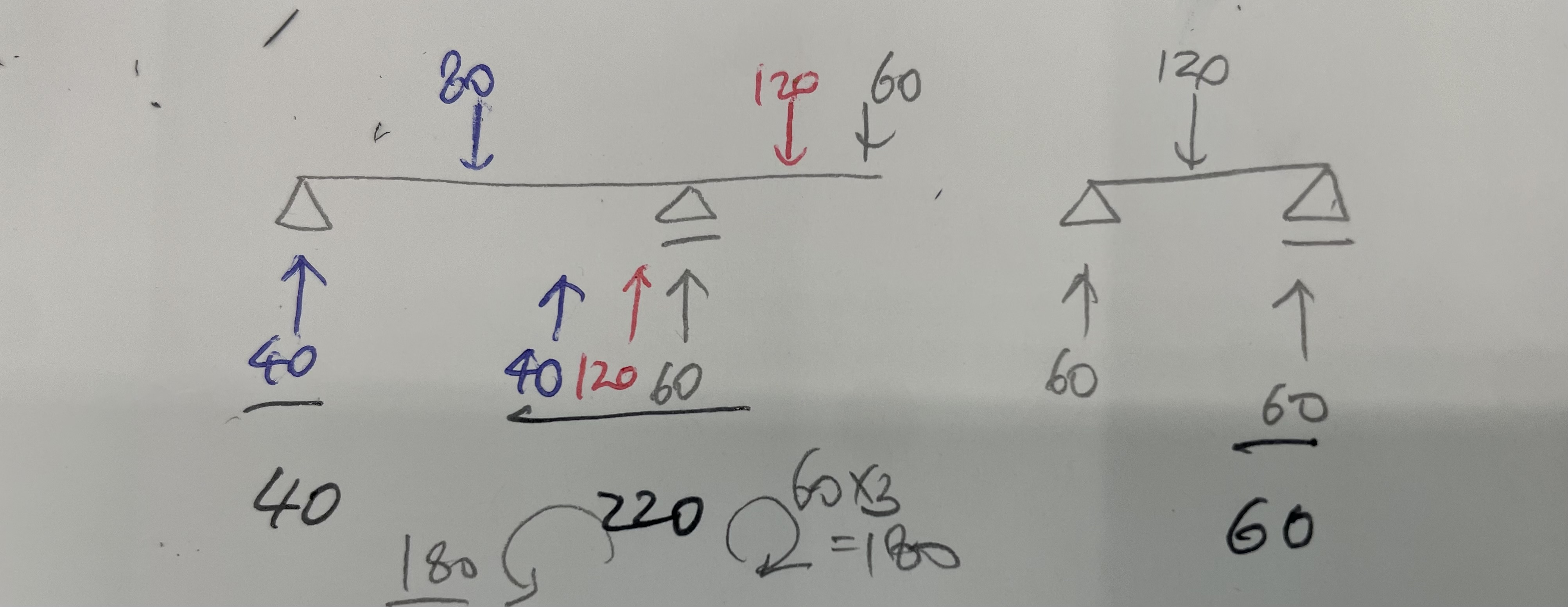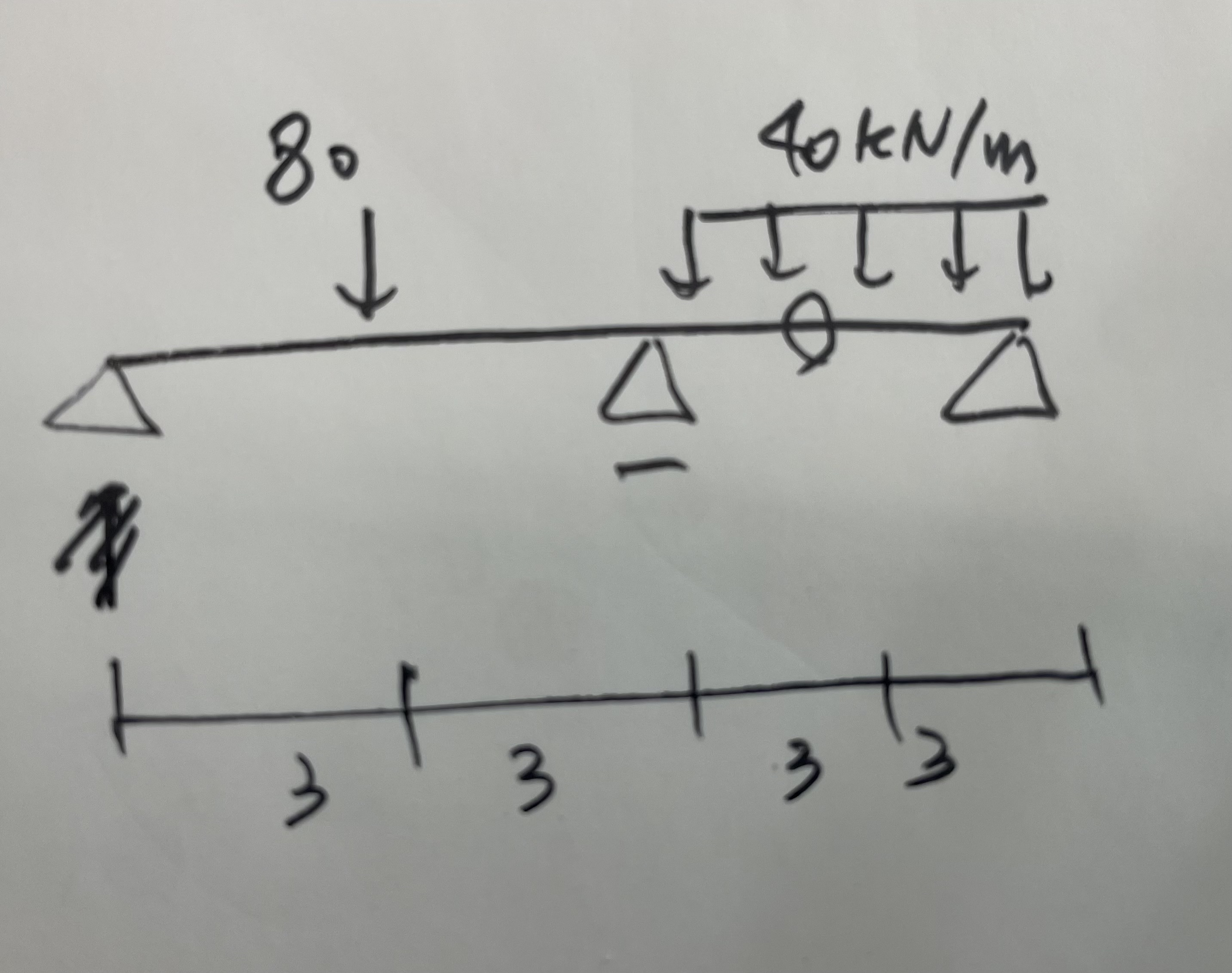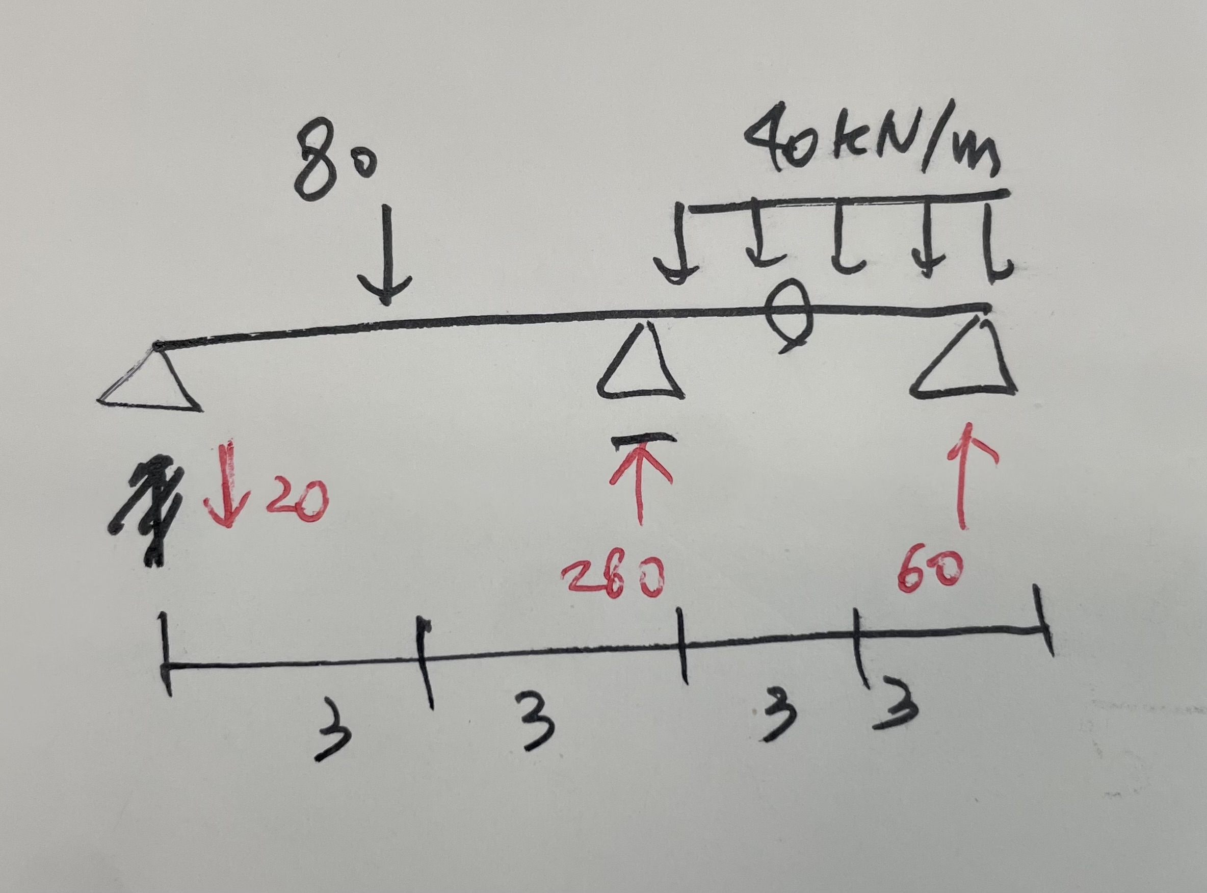 -(V_B)(6)+(80)(3)+(40*3)(7.5)+(60)(9)=0 으로부터 V_B=+280kN이 계산되고,