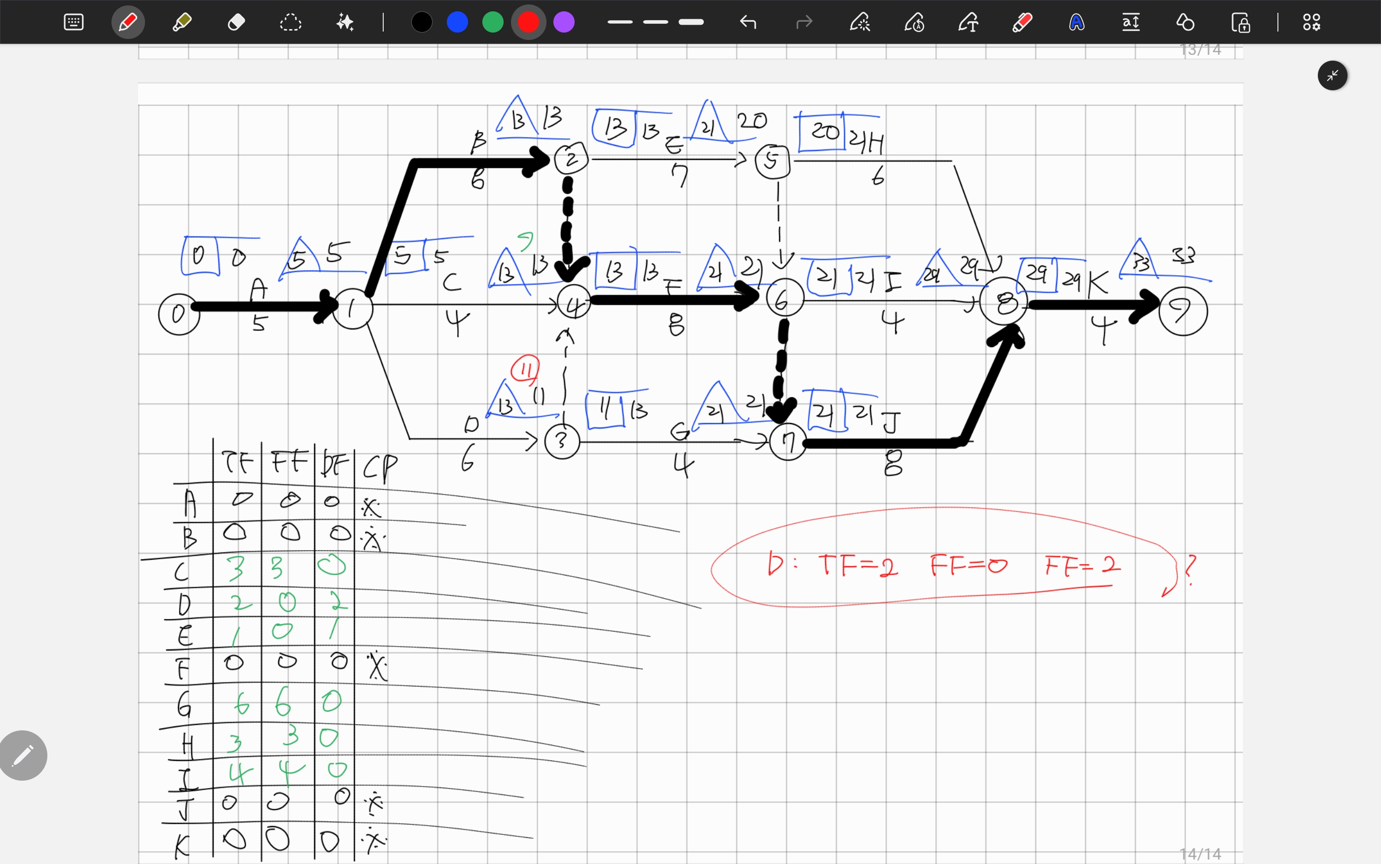 (2) 주공정선상의 작업들 이외의 나머지 작업들의 여유시간은 절대 변하지 않는다.