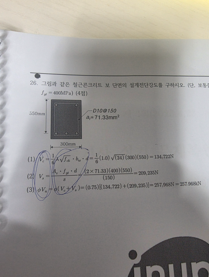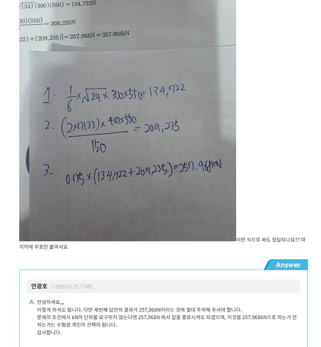 수험생들이 가장 많이 실수하는 것은 답을 257,968kN 으로 한다는 것을 알려드리고자 함입니다.