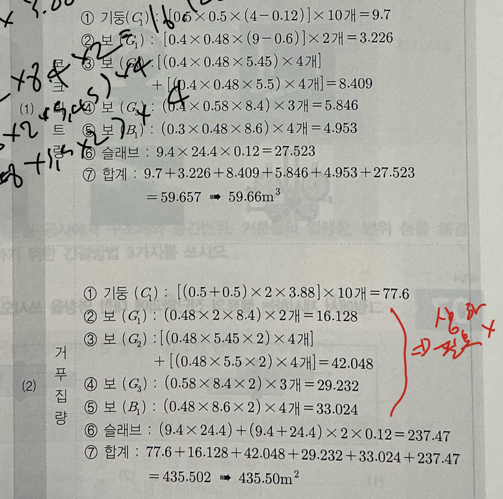 질문하신 문제는 기둥, 보, 슬래브의 수량을 산출하는 종합적산 문제로서 두번째의 방법을 적용하시어 문제를 풀어주시면 되겠습니다.