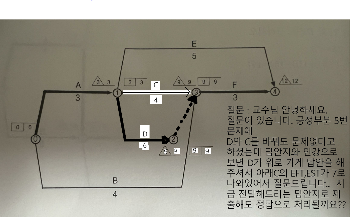 공정표는 하나만 답이 되는 경우는 거의 없으며 그려내신 공정표도 맞는 공정표입니다.
