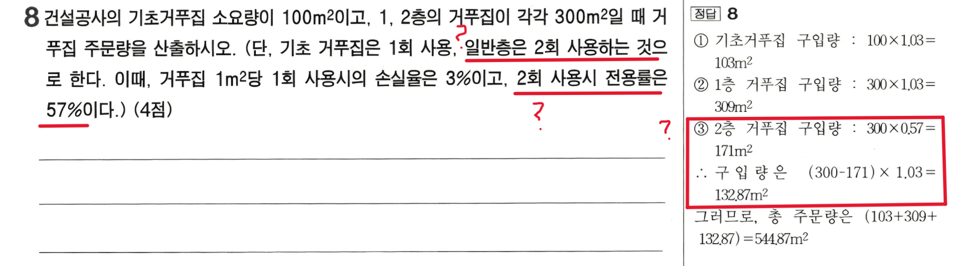 (2) 2층 거푸집은 2회 사용조건이므로 1층의 거푸집 중 57%를 전용(재사용)할 수 있으므로 거푸집량은 300X0.57=171입니다. 해설에서 이 부분 설명이 부족하여 이해가 안되셨던 것 같습니다. 171 뒤에 "(전용량)"이라는 표현을 추가하시기 바랍니다.