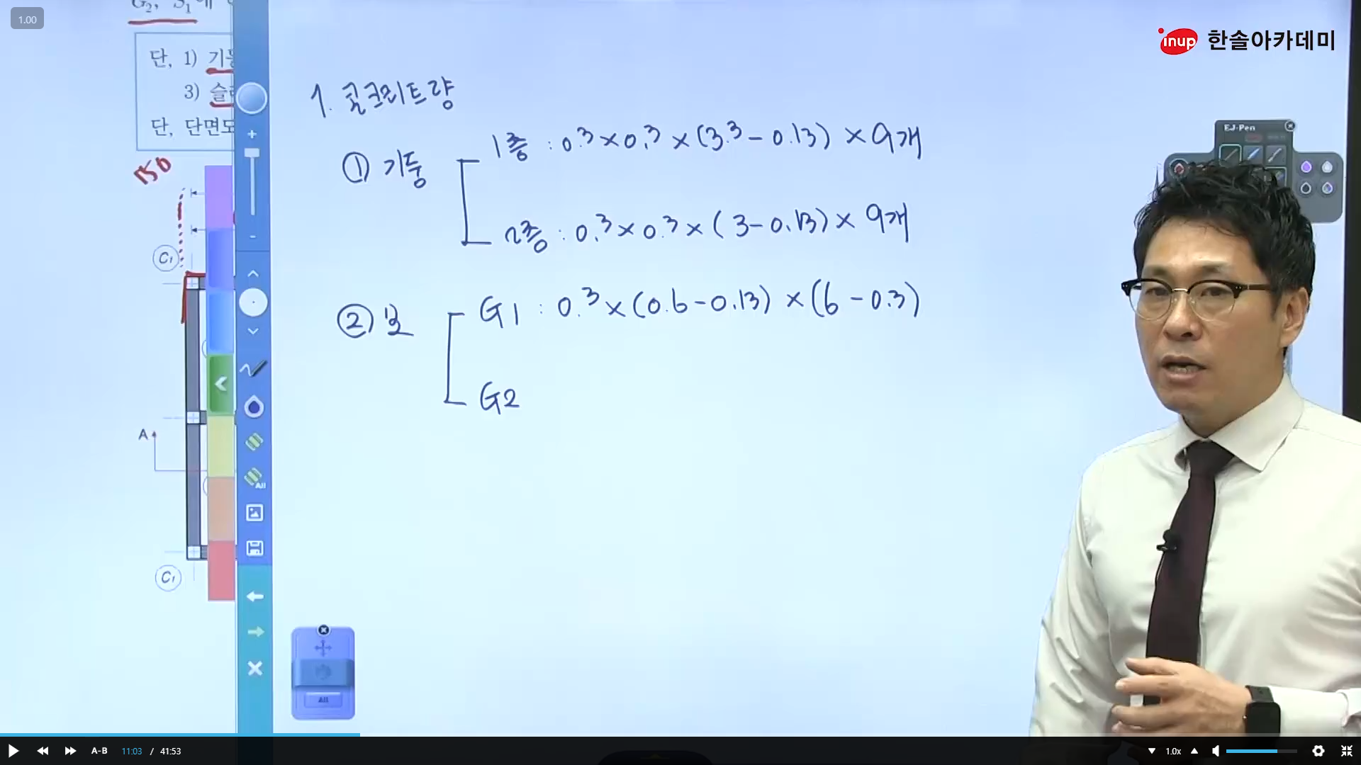 선생님 보 G1: 0.3(보의너비)*(0.6(높이) - 0.13(슬래브두께)) * 안목거리☞ (6*0.3) 0.3 기둥1개사이즈라고 하셨는데 기둥1개사이즈가 어떻게해서 저값이 나오는지 전혀 모르겠어요..ㅜ