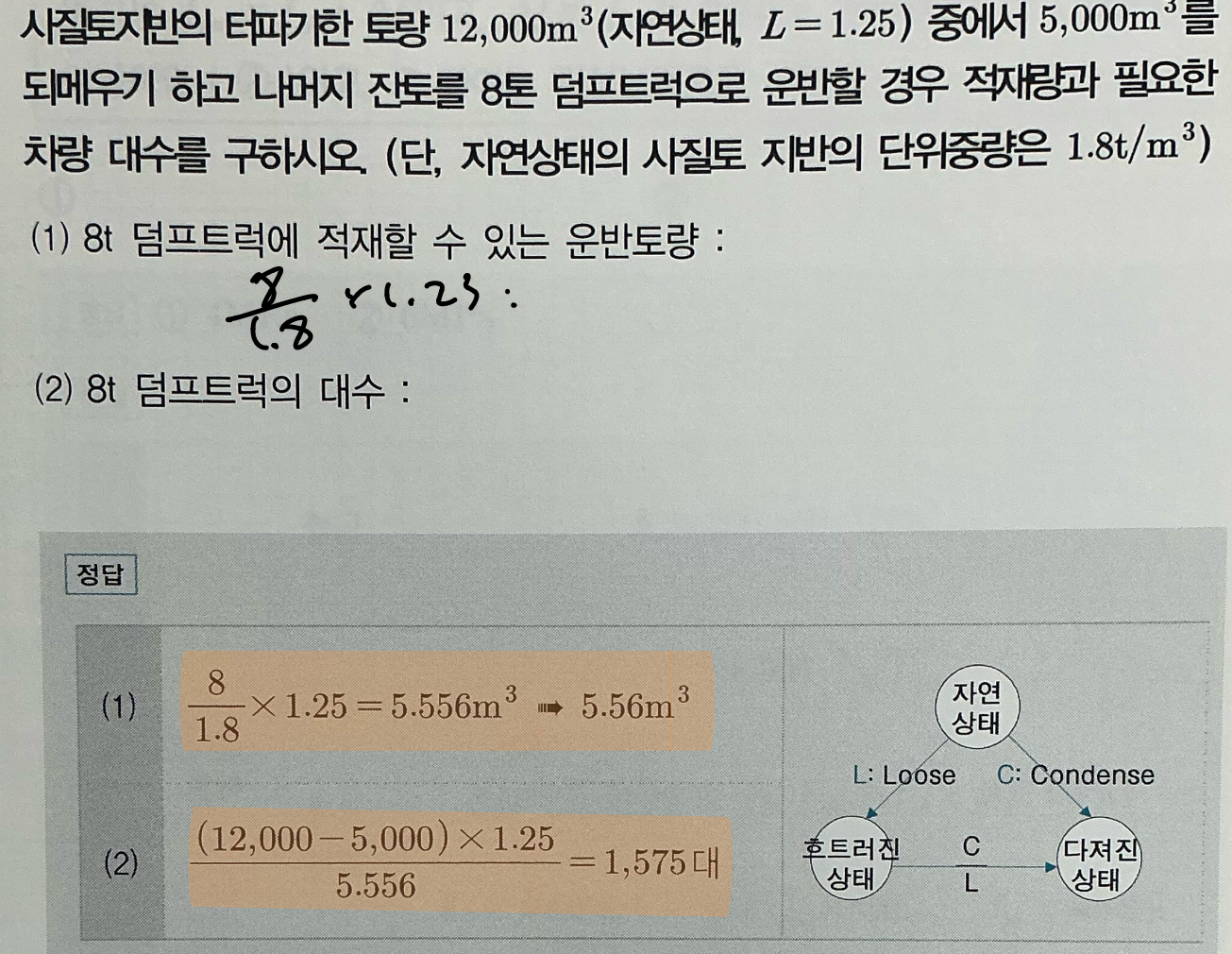 만약, 문제에서 흐트러진 상태의 단위중량이 주어지게 되면 적재중량을 흙의 단위중량으로 나누어주면 됩니다.
