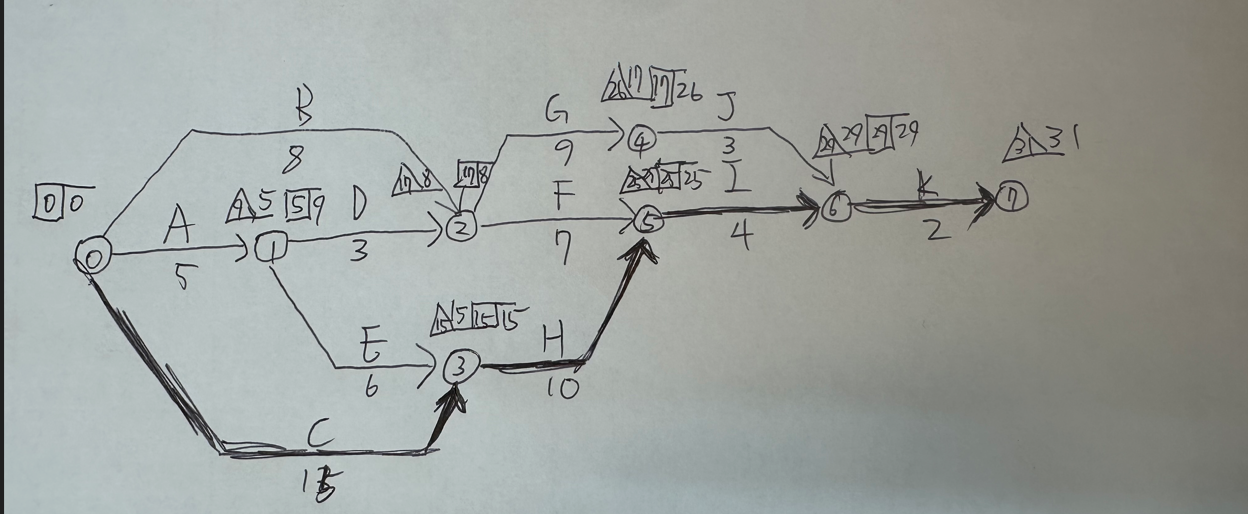 이미처럼 공정표를 작성했습니다. 예제에 나오는 배열과 다르지만 est ,lst, 주공정선 등은 전부 일치하는데 이것도 채점이 될까요?