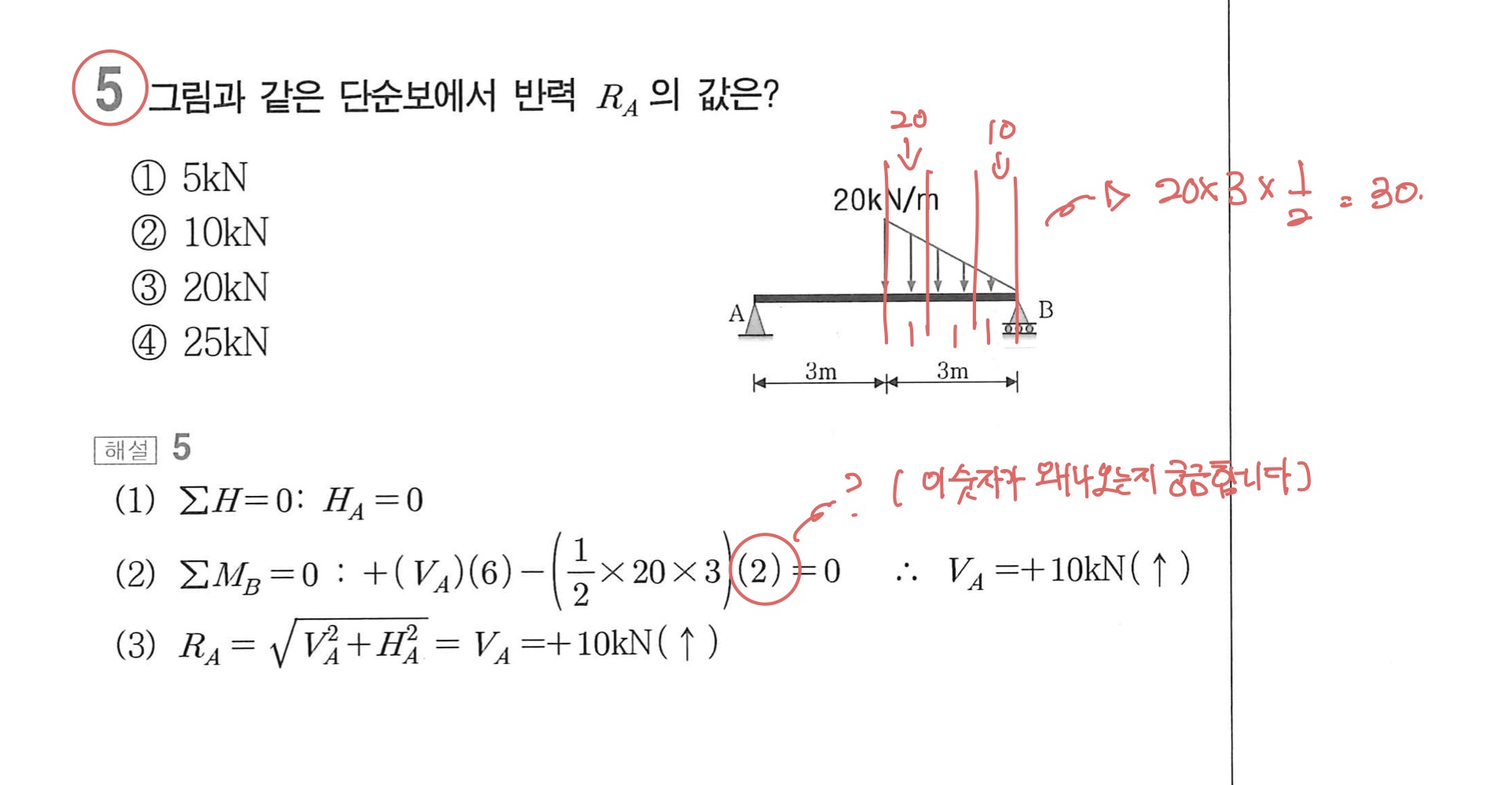 5번 문제에서 삼각형의 면적을 집중으로 치환한 것은 B점에서 2m의 위치에 있을 것입니다.