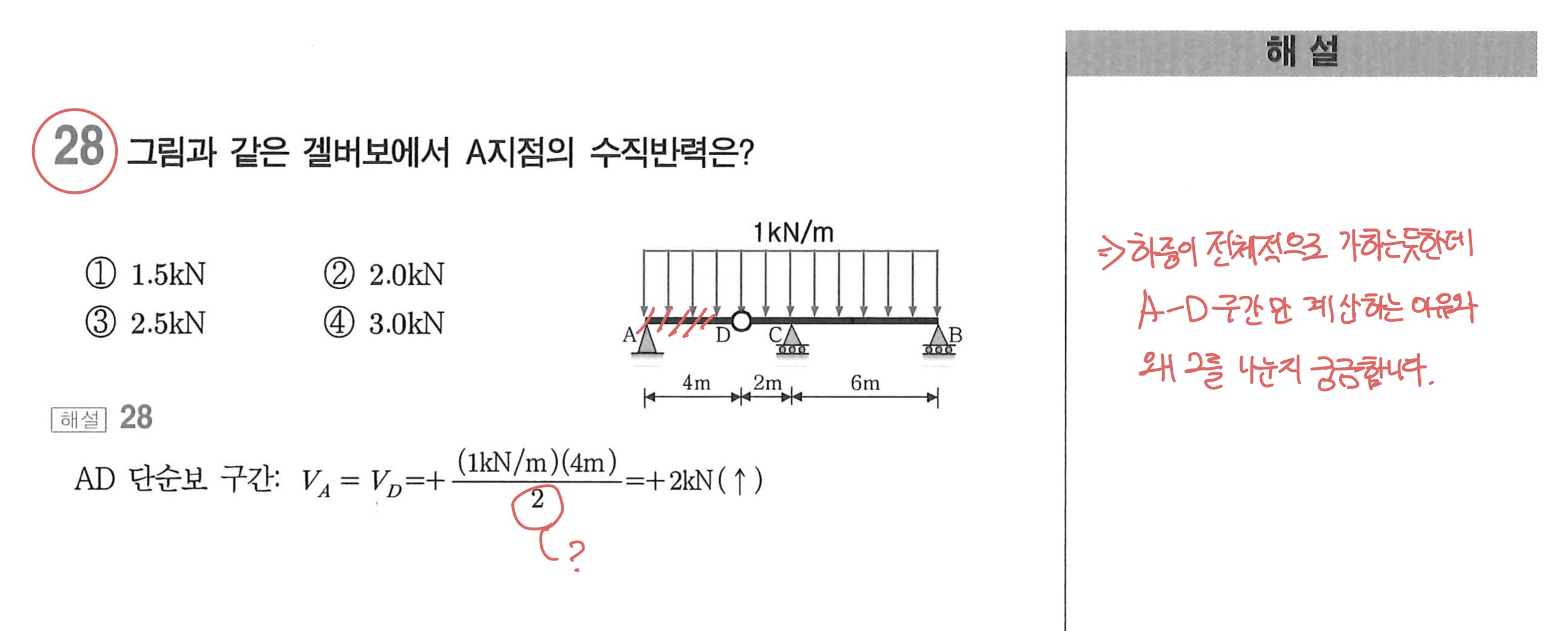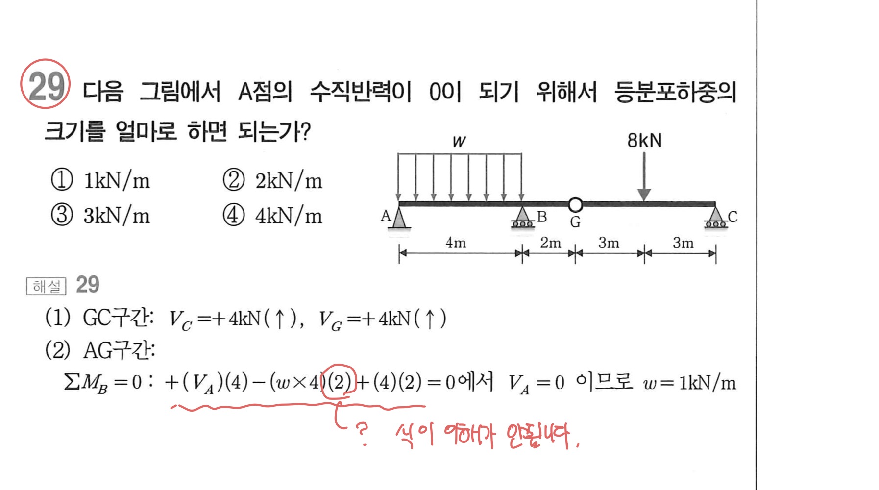 29번 문제에서 B점에서 모멘트평형조건을 적용하고 있으므로 직사각형의 면적 w*4를 집중하중으로 치환한 위치는 B점에서 좌측으로 직사각형 길이의 절반 위치인 2m가 되겠습니다.