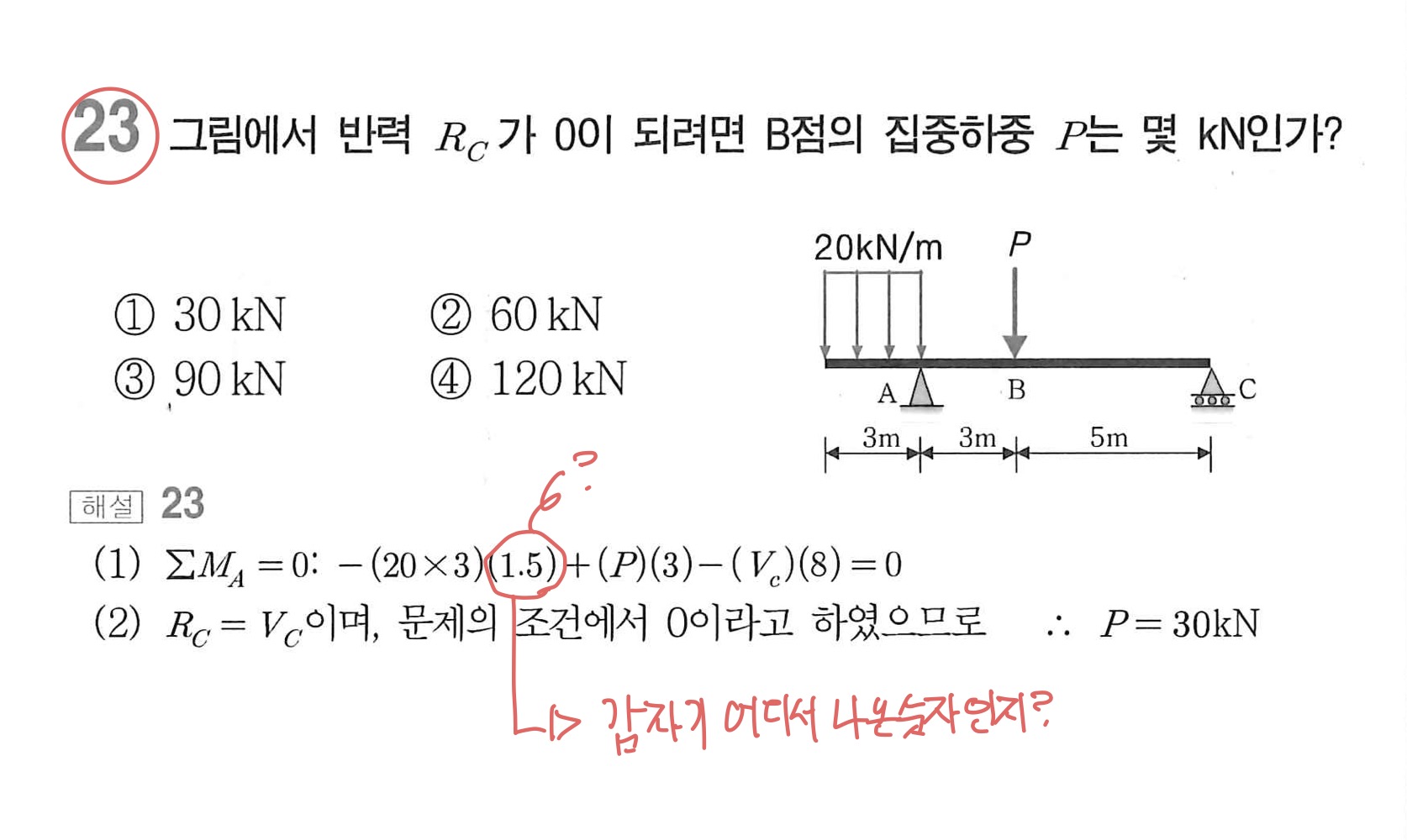 23번 문제에서 A점에서 모멘트평형조건을 적용하고 있으므로 직사각형의 면적 20*3을 집중하중으로 치환한 위치는 A점에서 좌측으로 직사각형 길이의 절반 위치인 1.5m가 되겠습니다.