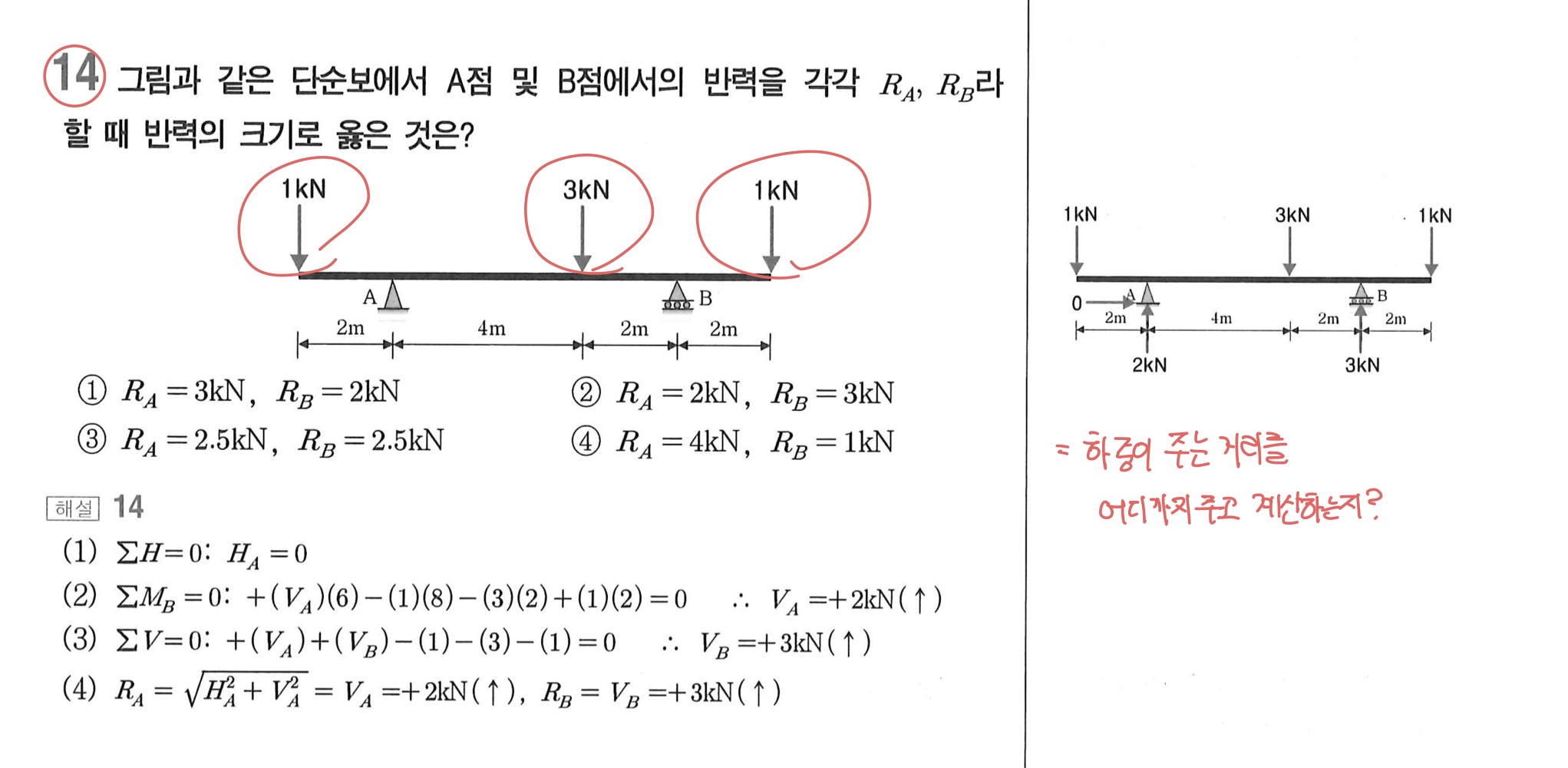 14번 문제에서 B점에서 모멘트평형조건을 적용하고 있으므로 1kN은 8m, 3kN은 2m, 1kN은 2m의 위치에 있음을 관찰하시면 되겠습니다.
