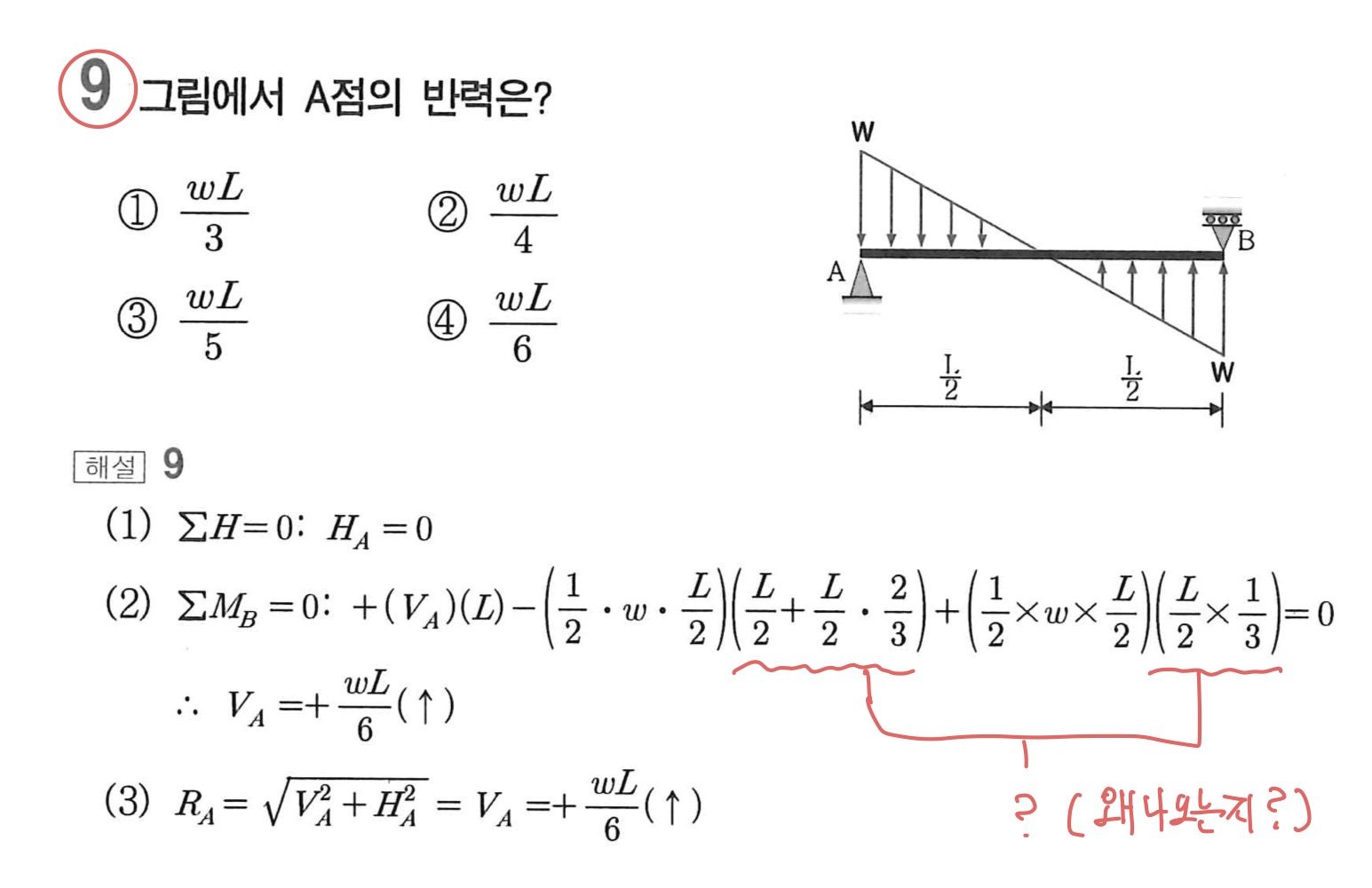 9번 문제에서 중앙점을 C라고 하면 AC구간의 삼각형의 면적을 집중으로 치환한 것은 B점으로부터 L/2 + L/2 * 2/3 위치에 있을 것이고, CB구간의 삼각형의 면적을 집중하중으로 치환한 것은 B점으로부터 L/2 구간내에서 2/3 위치에 있을 것입니다.