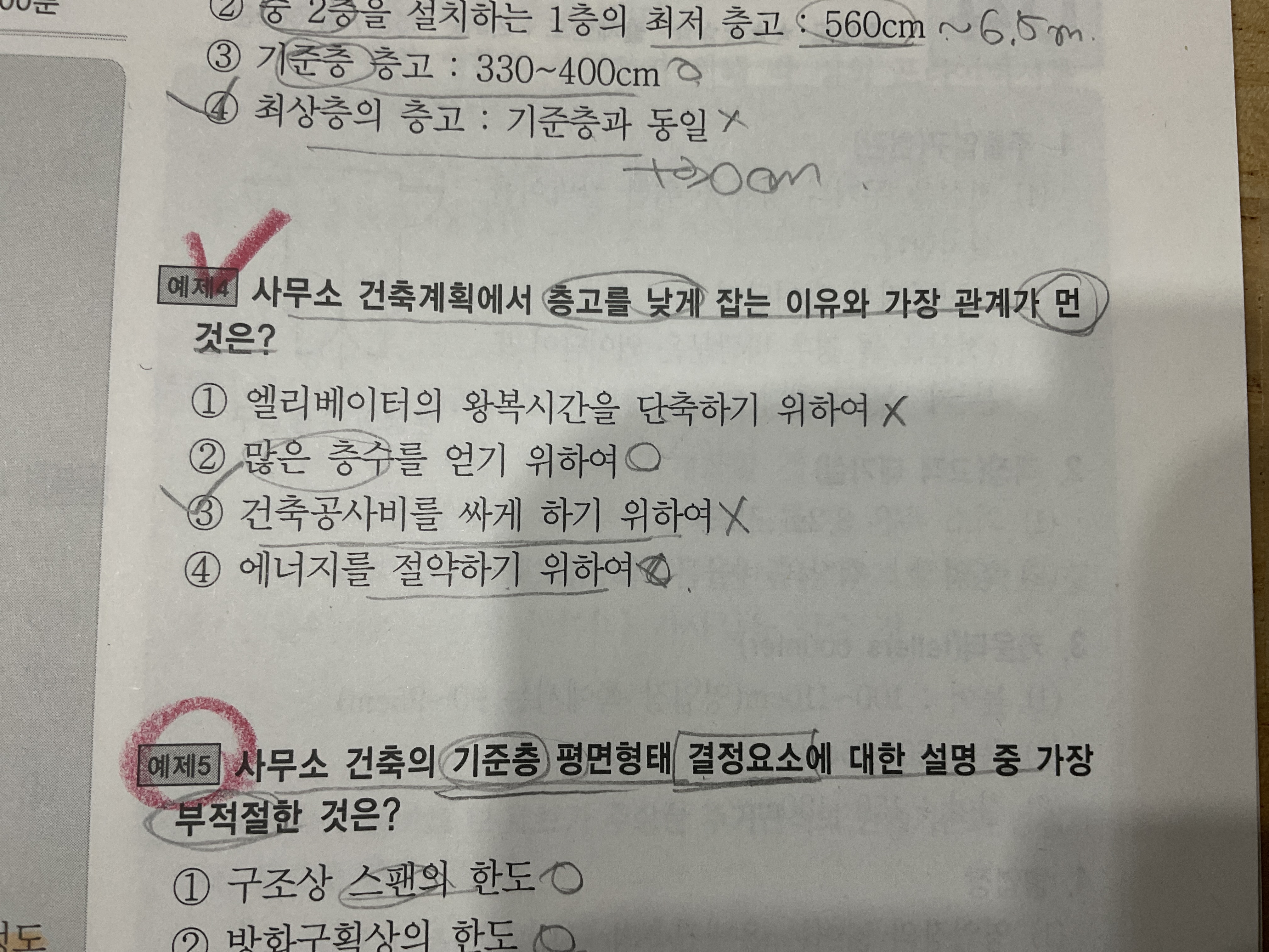 핵심번호 3번 예제4번 문제 입니다. 층고가낮아지면 결국 층수가 증가함에 따라 엘리베이터 왕복 시간이 늘어나고 또, 각 층마다의 설비등이 늘어나면서 건축공사비도 늘어나야 하는거 아닌가요? 층고가 낮아지면서 층수가 늘어날텐데 왜 건축비가 싸지는지 궁금합니다.