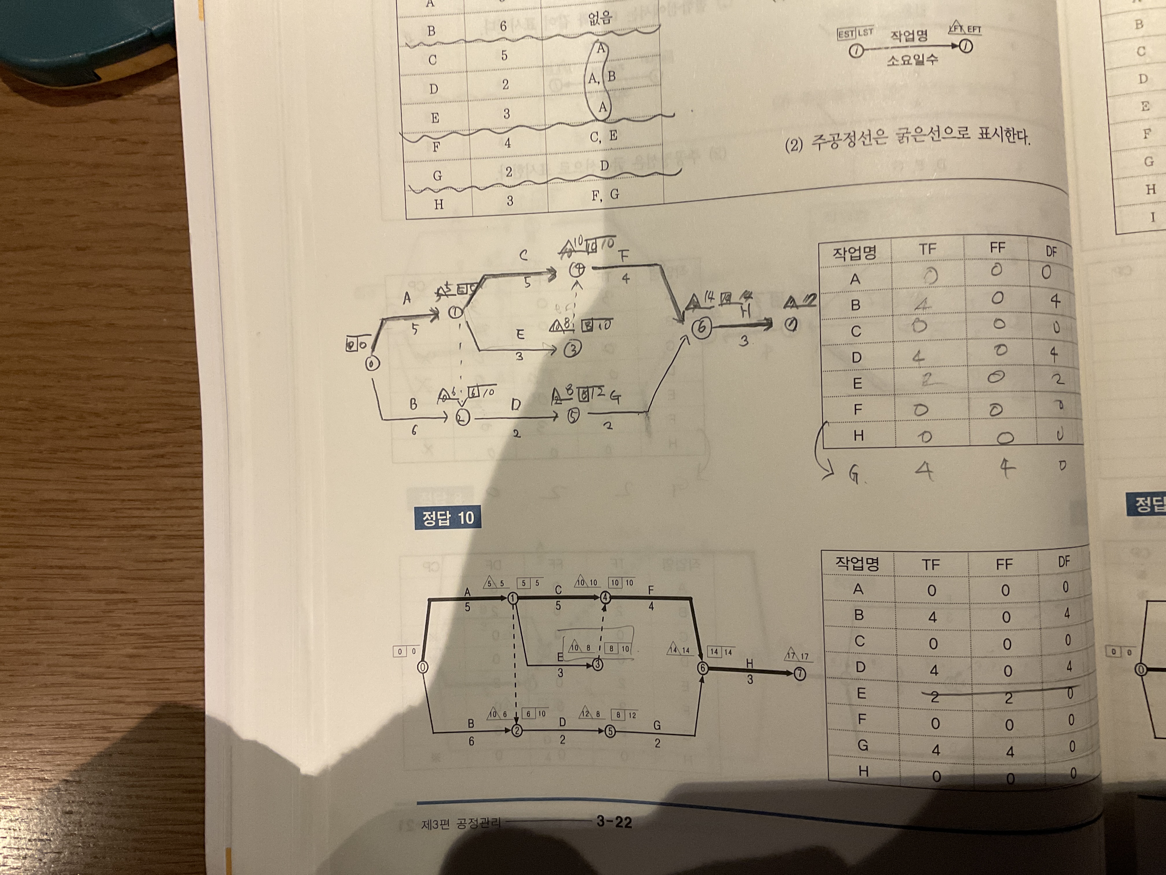 공정관리 3-22페이지 10번 문제에 E의 풀이에 대해 문의 드립니다.