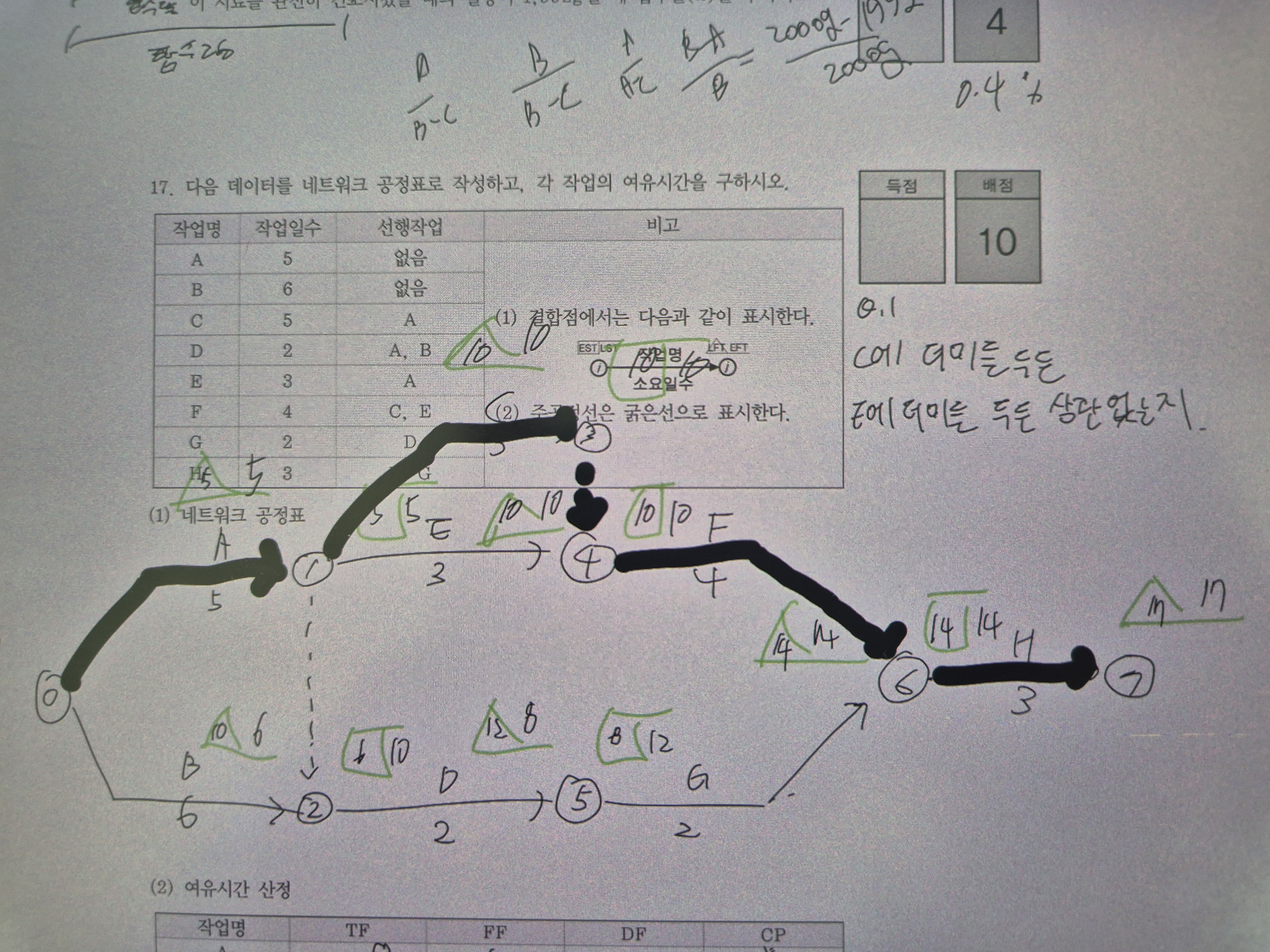 (2) 주공정선상의 작업들 이외의 나머지 작업들의 여유시간은 절대 변하지 않는다.