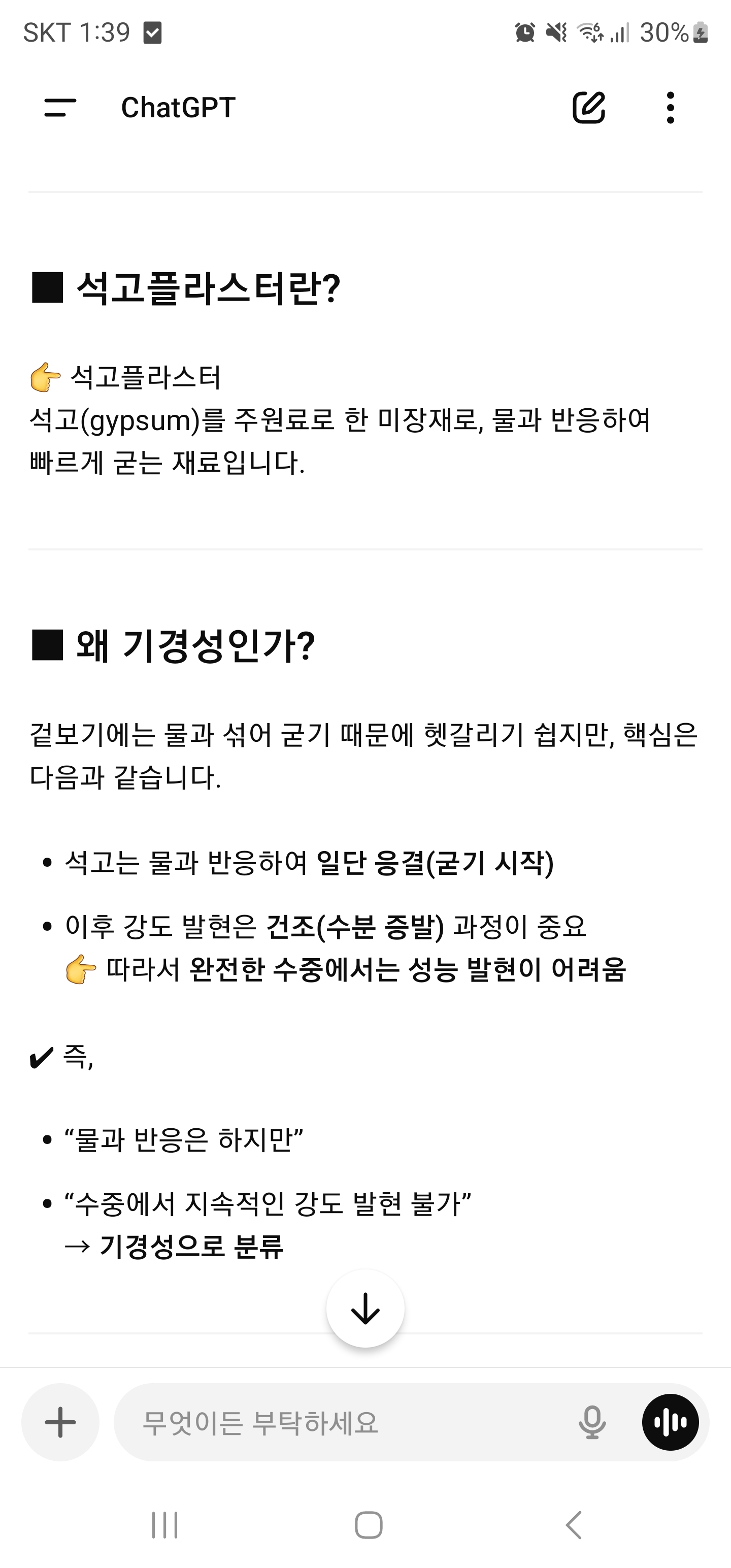석고재료가 수중경화가 가능한지에 궁금증이 생겨 챗지피티에 문의해보았는데