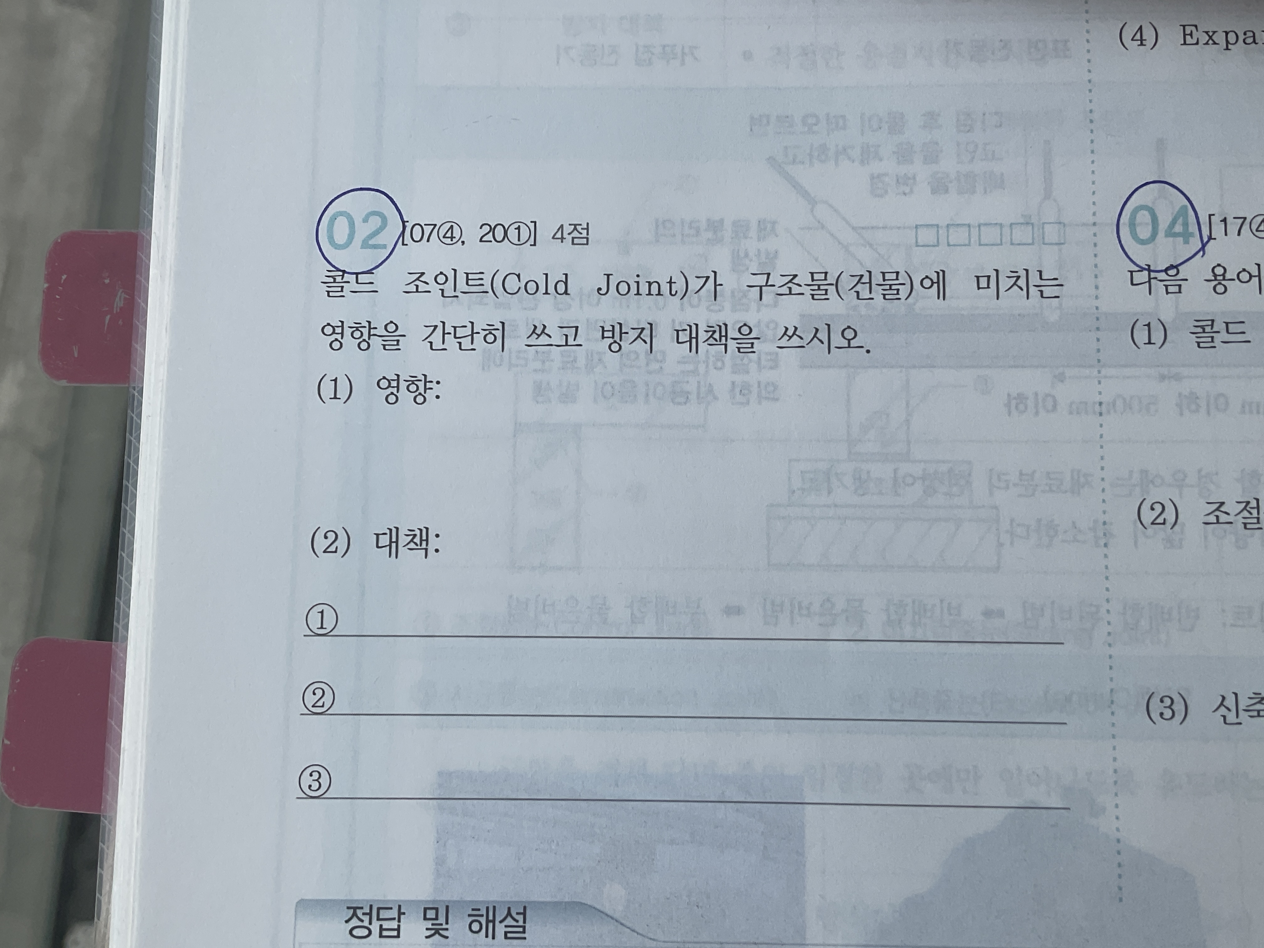 20년도 1회차 콜드조인트 영향이 (1)번 문항으로 되어있고 따로 세부항목이 없는데 콘크리트 경화 후 균열 발생, 누수에 의한 철근의 부식, 마감재의 균열 발생, 구조물의 내구성 저하 이 네가지를 모두 적지 않으면 0점인걸까요? 아님 이 중 두가지정도만 적어도 정답처리 가능할까요..?
