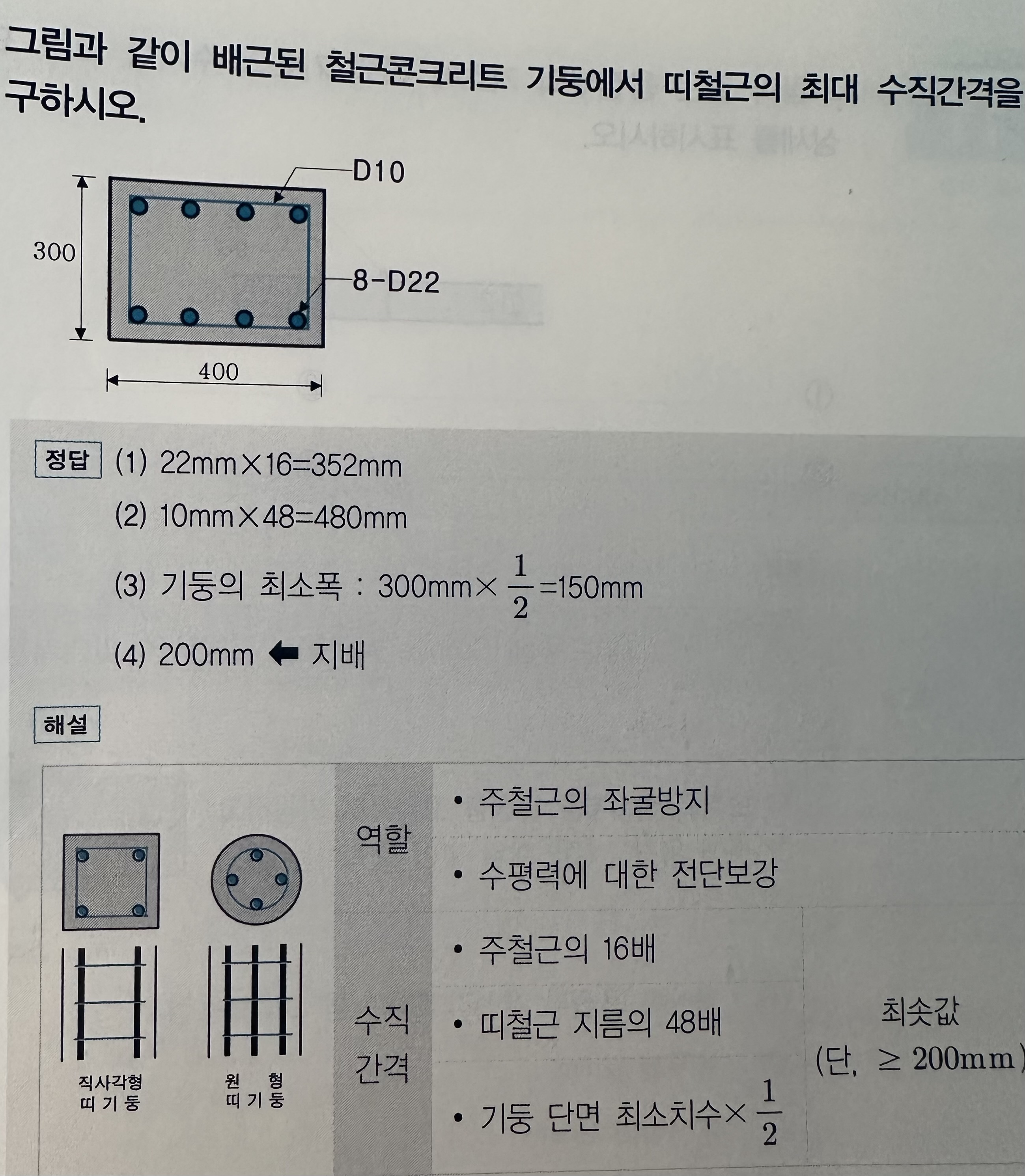 이 문제에서는 최솟값이 150mm가 선정되었는 데, 150mm는 200mm보다 작기 때문에 수직간격이 강제적으로 200mm가 된다는 내용입니다.