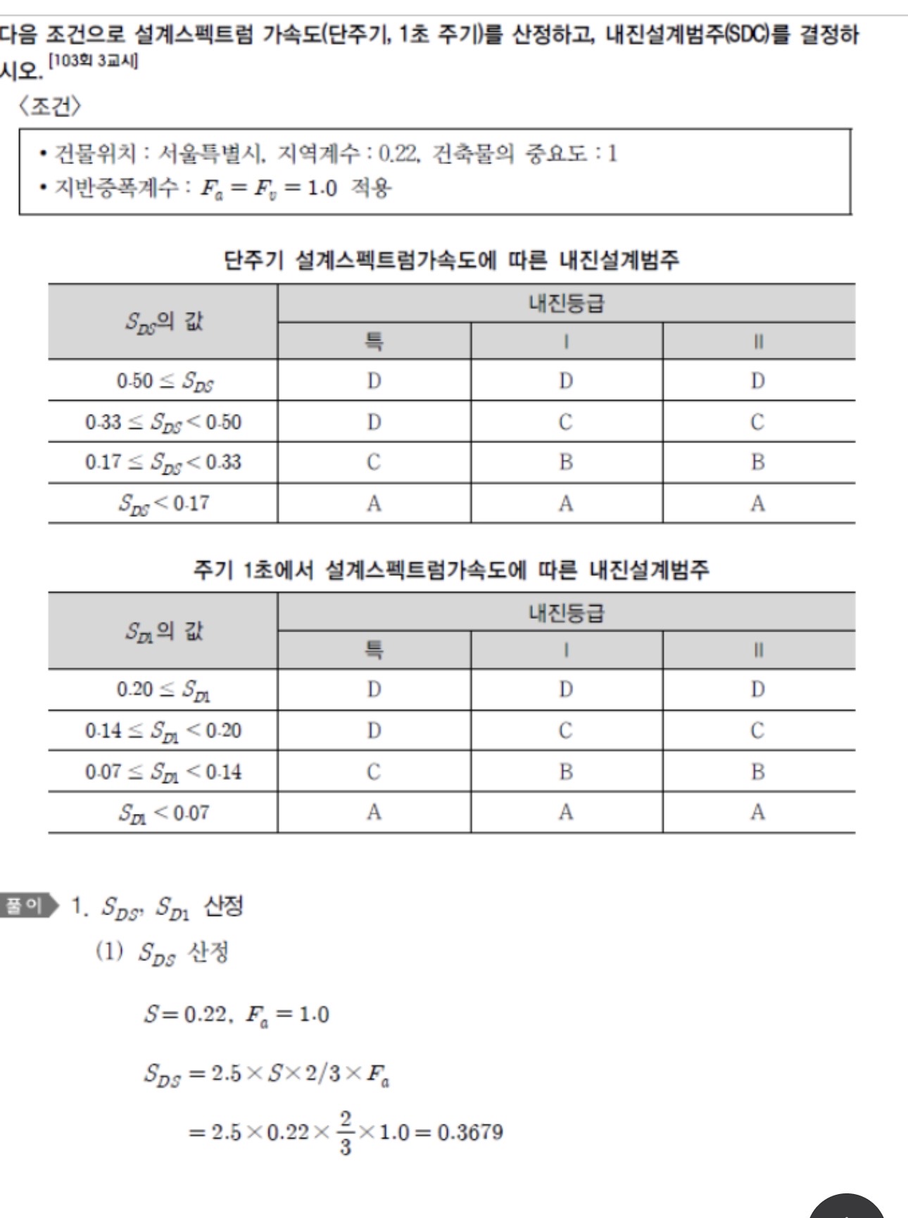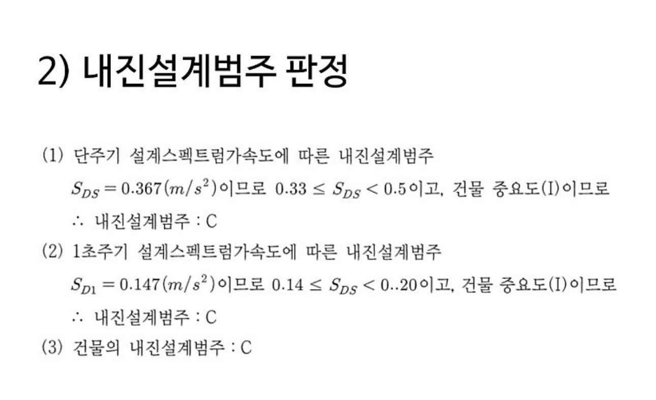 설계스펙트럼가속도는 결국 단주기와 주기1초 두개의 계산식에 의한 등급을 각각 선택하여 둘 중의 높은 수준의 범주로 선택(A<B<C<D)시켜 구조설계법을 정적설계법으로 가져갈 것인지, 아니면 동적설계법으로 가져갈 것인지의 단초라고 보시면 되겠습니다.