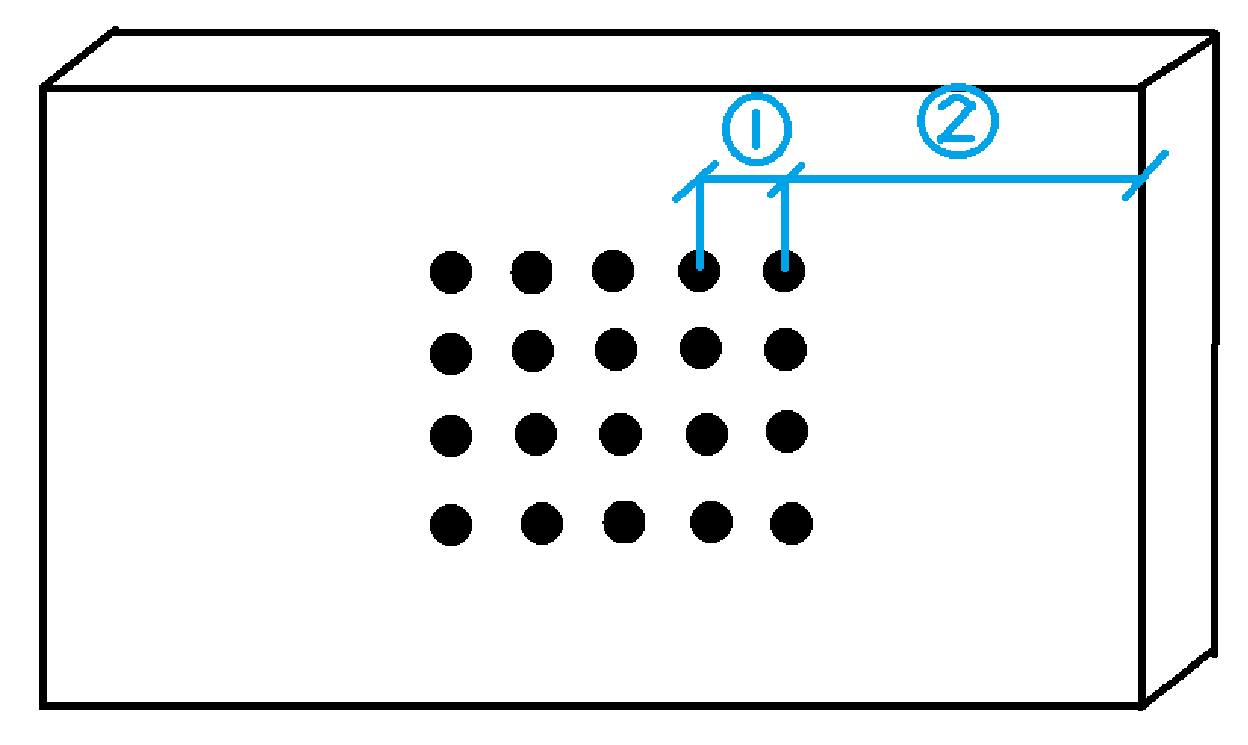 5. 콘크리트면에서 5*4개의 타격점을 아래처럼 그림으로 제시하며, 슈미트해머법에서 타격 간격 및 부재 끝까지의 거리를 물어봤는데 (1) 30mm, (2) 100mm로 답안 작성하였는데 맞을까요?