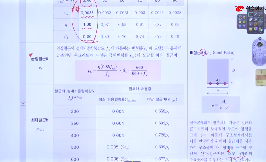C T 우력 공식을 통해서 를 얻었습니다. As/bd는 철근비이니 위 공식에서 순인장변형률의 값에 입실론s, 입실론y, 입실론a,min을 넣느냐에 따라서 임의의 철근비, 균형 철근비, 최대 철근비를 구할 수 있는 것 같습니다. 제가 유도를 제대로 한 것인지, 이렇게 이해를 하고 문제 풀이에 써도 되는지 궁금합니다.