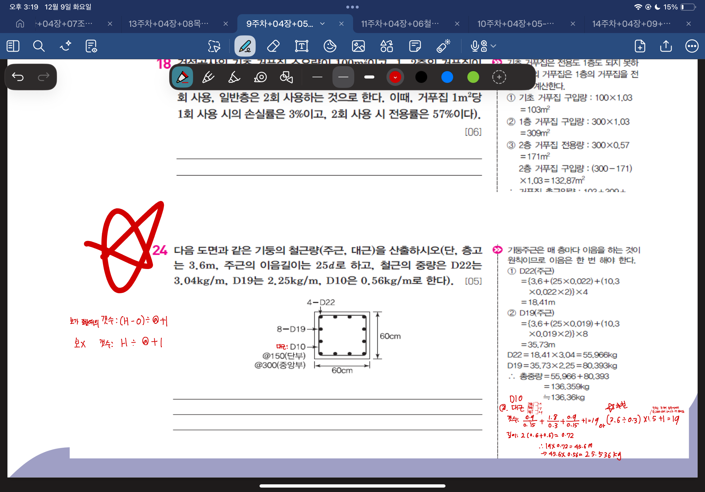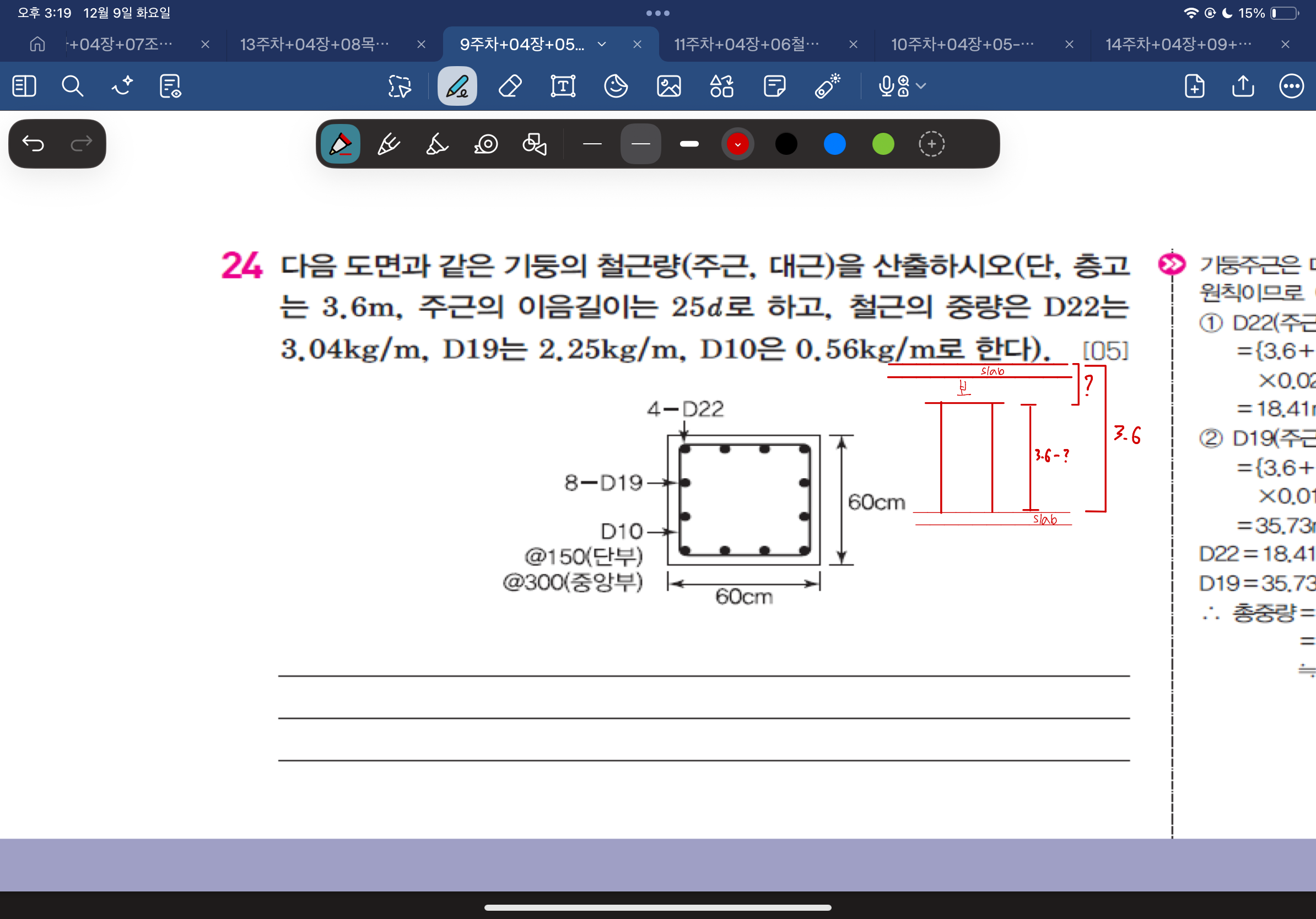 아래의 첫번째 사진은 기둥이 보에 걸치지 않고 바로 슬래브랑 연결되어 층고의 길이가 3.6m임을 상정하고 문제에서 요구하는 있는 그대로를 산출한 철근의 대근량입니다.