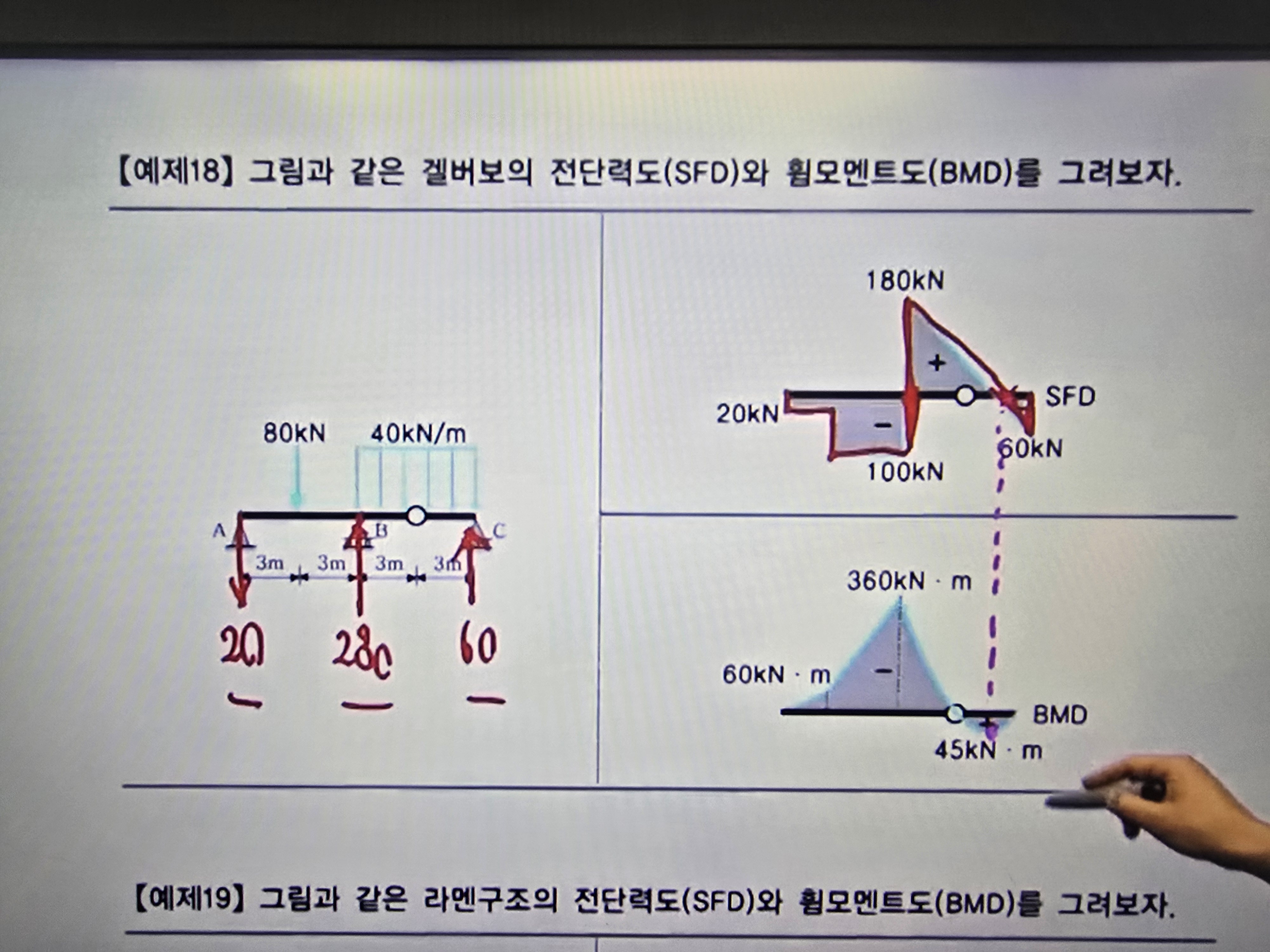 전단력도를 그리기 위해 각지점에서의 반력을 구해야하는데 A지점 20KN, B지점 280KN, C지점 60KN이 어떻게 구해지는지 풀이요청드려도 될까요?