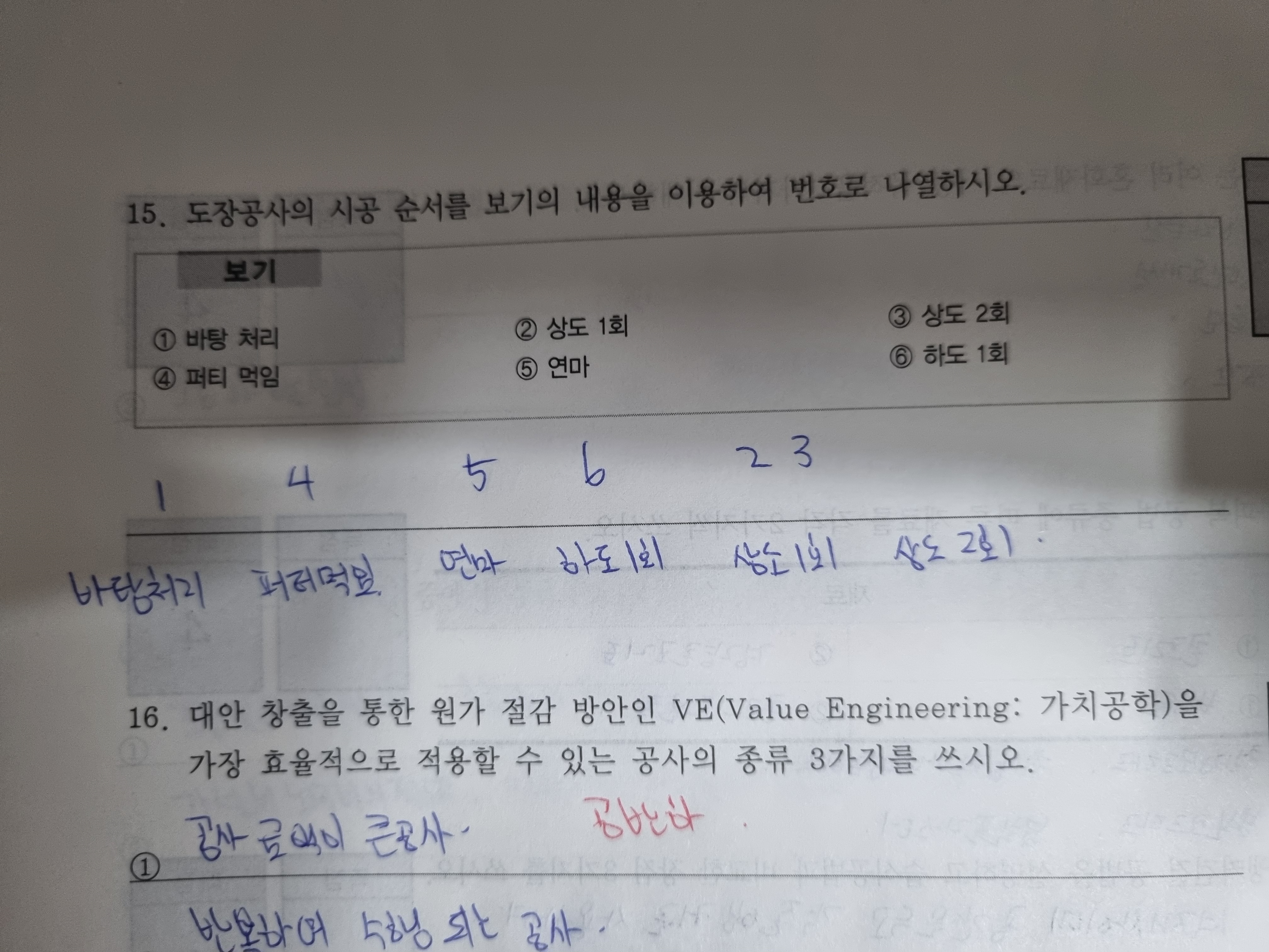"실무에서는 마감 품질(이색 방지)을 위해 퍼티 후 하도를 또 하기도 하지만, 시험 답안의 정석(Standard)은 하도가 먼저 맞습니다.