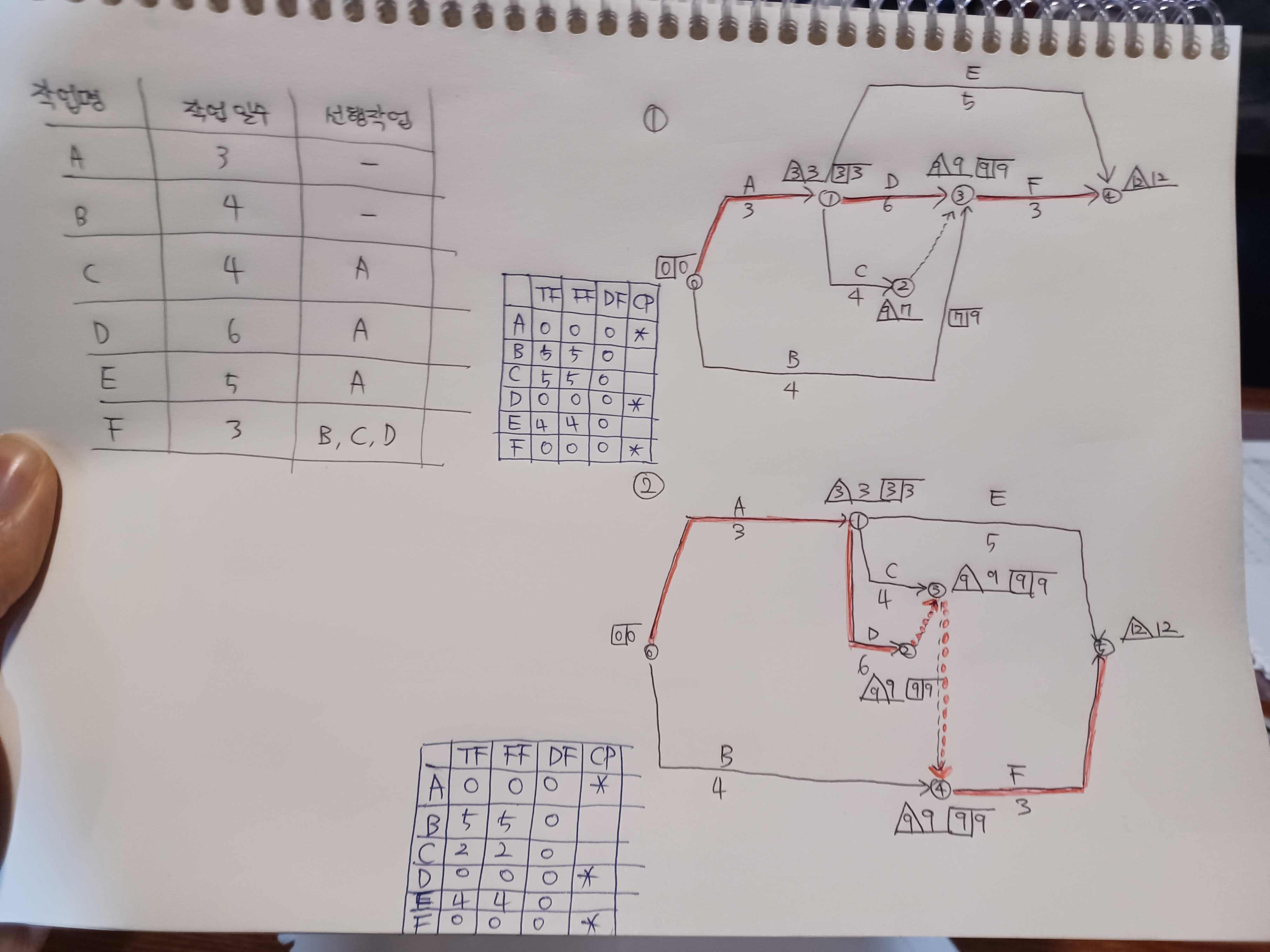 문제의 데이터에서 요구하는 관계의 의미가 B,C,D가 종료된 하나의 이벤트에서 F작업이 출발한다는 것입니다. 그런데, 여기서 C와 D가 시작과 끝이 같기 때문에 둘 중의 하나를 넘버링더미로 처리해야 하는 상황인데, 학생이 그린 1번의 공정표는 문제조건에 부합되지만 2번 공정표는 이러한 의미를 발견할 수 없으므로 문제조건에 위배된 잘못 그려진 공정표입니다.