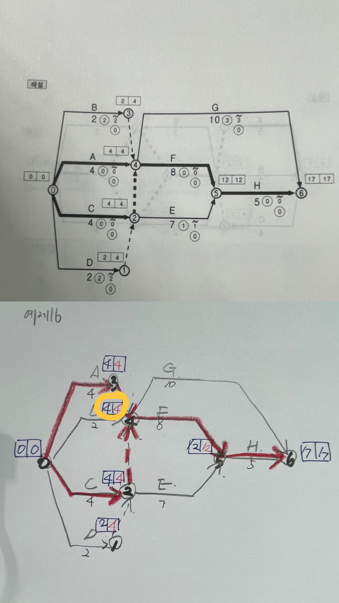 오직 이 경우에만 해당작업의 여유시간 계산은 바로 다음의 이벤트에서 계산한다고 기억해두시고, 나머지 경우는 해당작업의 종료이벤트에서 여유계산을 합니다.
