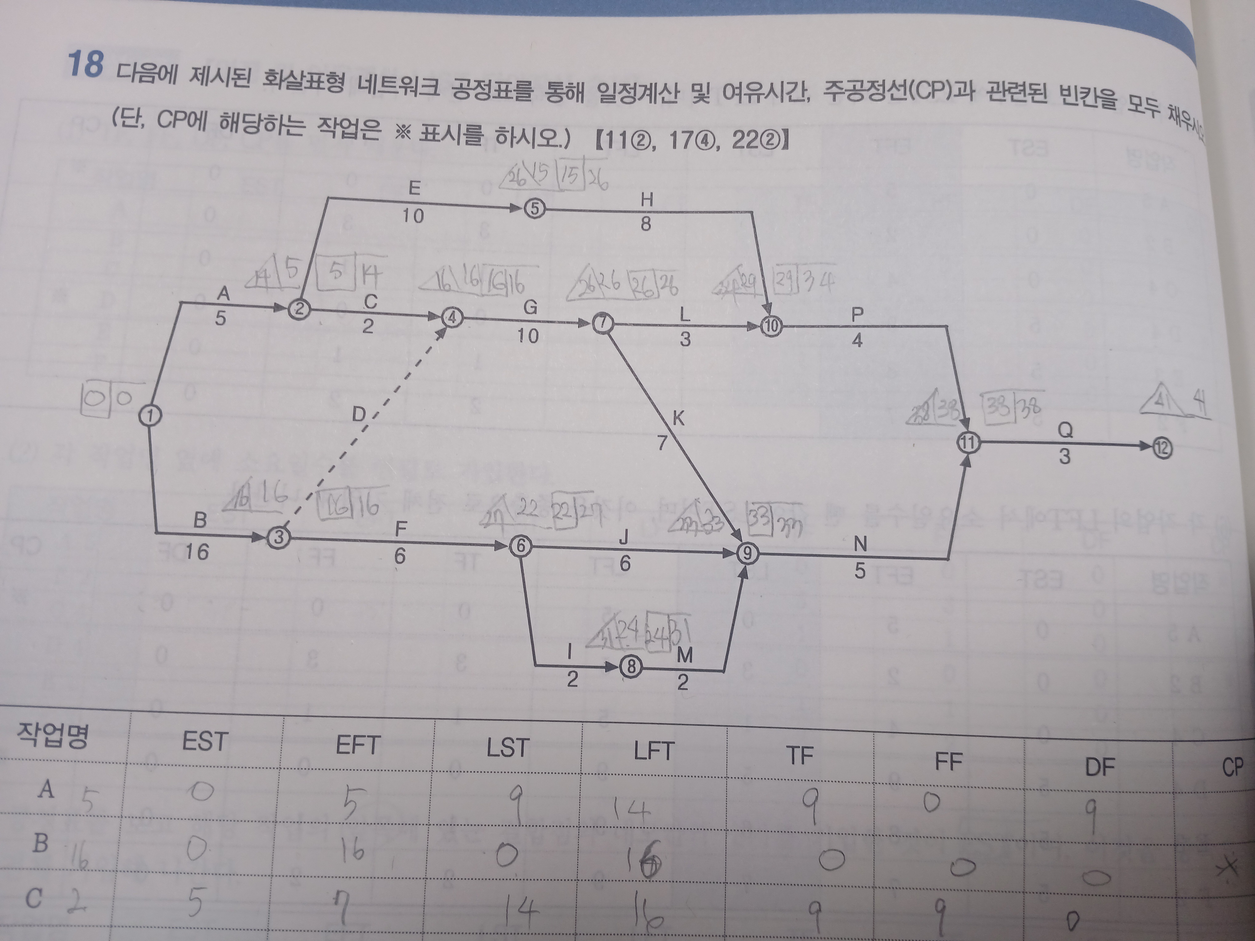 문제의 조건에서 제시한 공정표 상에 어떠한 표시를 하라는 요구가 없으므로, 연필로 표현된 일정을 모두 지우든가, 아니면 일정을 검정색 (볼)펜으로 표현한 후 연필자국을 없애서 계산의 근거를 보여주든가 둘 중의 하나를 선택하시면 되겠습니다.
