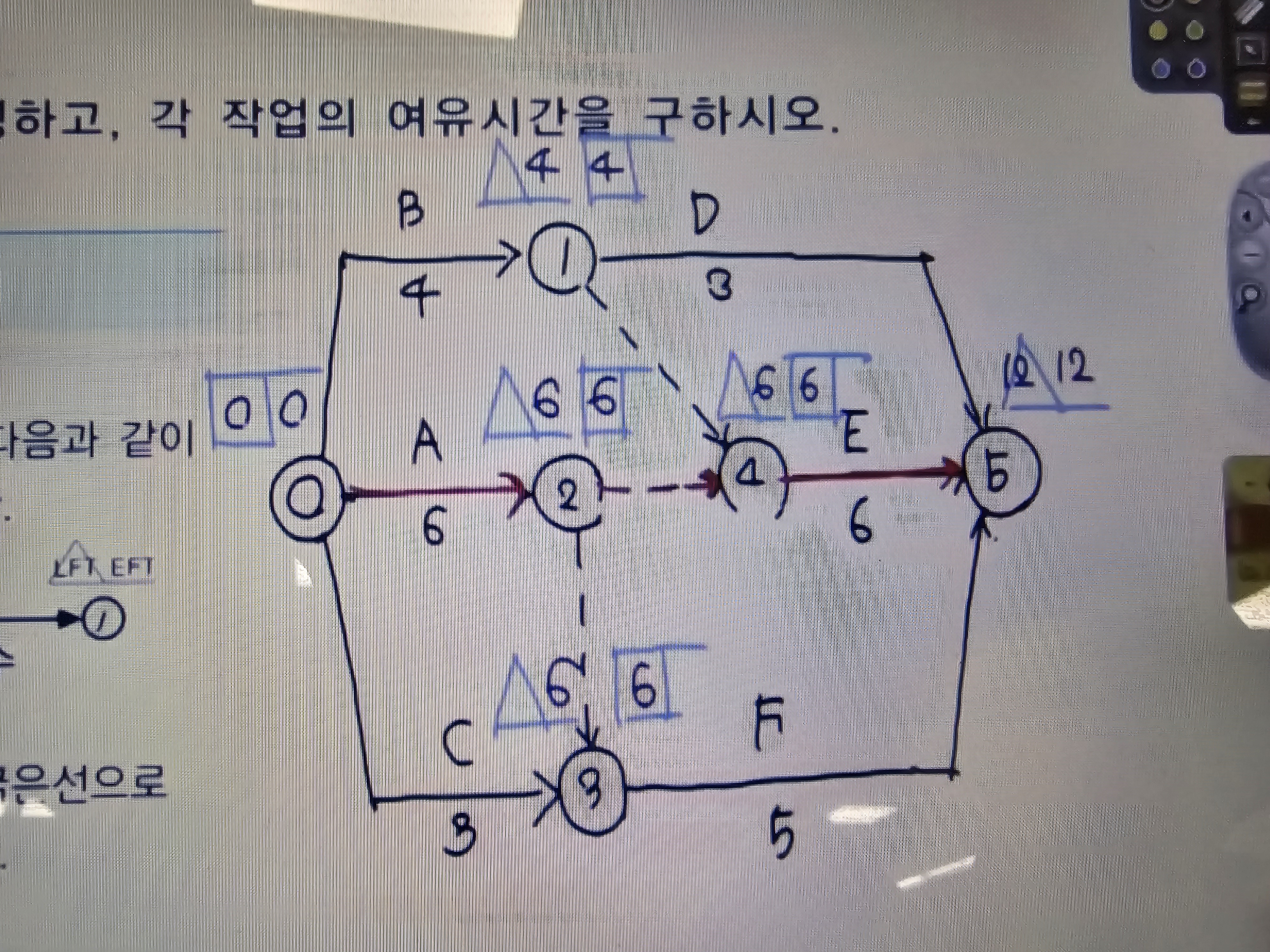 오직 이 경우에만 해당작업의 여유시간 계산은 바로 다음의 이벤트에서 계산한다고 기억해두시고, 나머지 경우는 해당작업의 종료이벤트에서 여유계산을 합니다.
