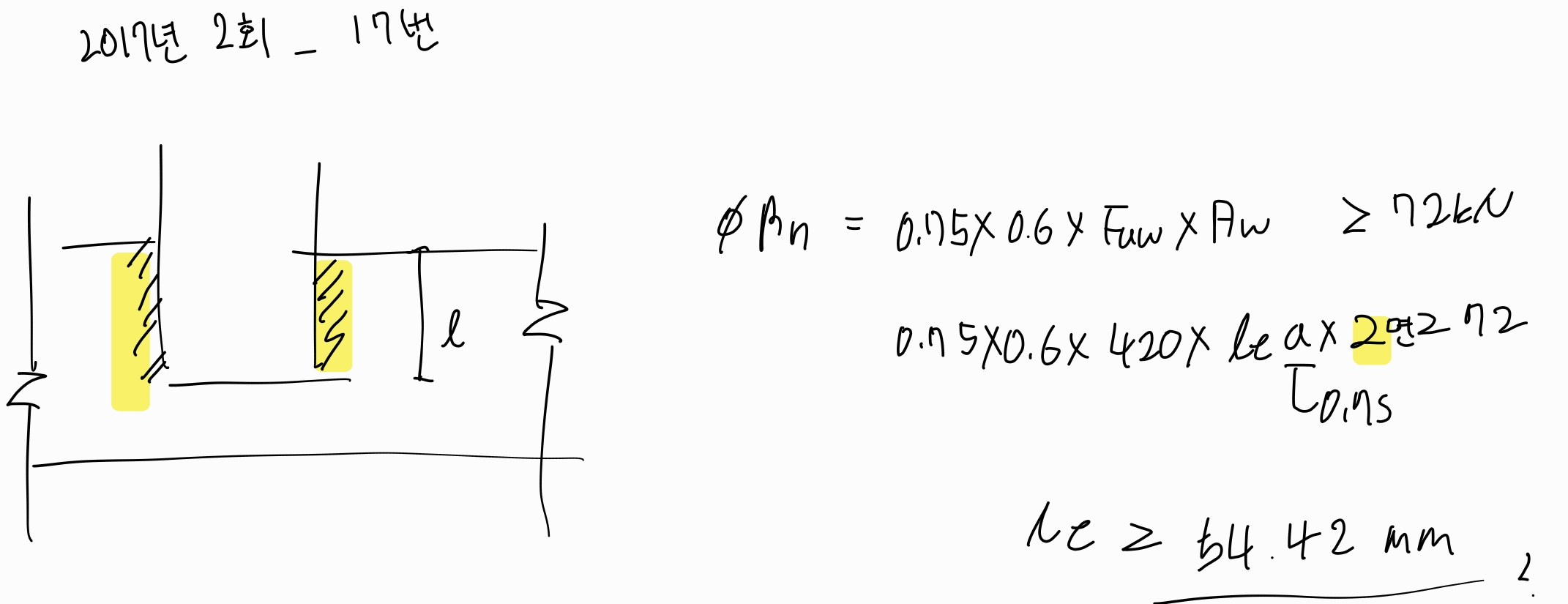 2017년 2회 17번에 설계 강도를 구할때 2면으로 용접이 되었으니 2를 곱하고 le를 구해야하지 않나요.?