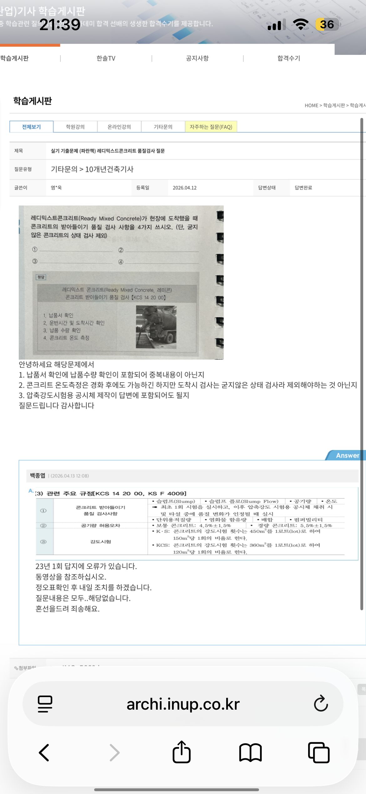 그리고 굳지않은 레디믹스콘크리트 검사사항