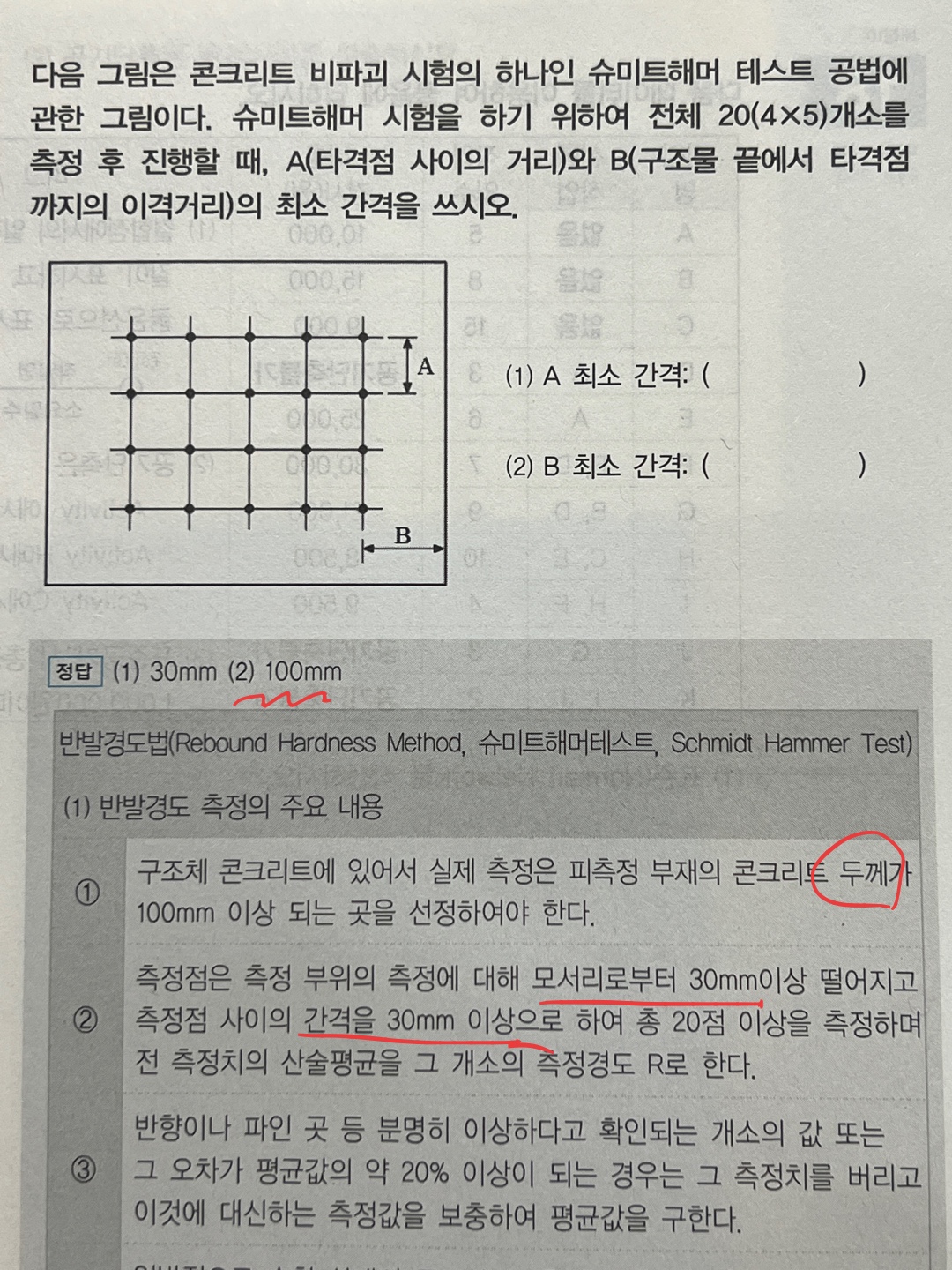 수험생분들이 간혹 A(측정점 간격)와 B(모서리 이격)를 모두 30mm로 동일하게 혼동하는 경우가 있습니다. 하지만 규정된 표준 측정 방식은 두 구간의 목적이 다르므로 수치를 명확히 구분하여 작성해야 합니다.